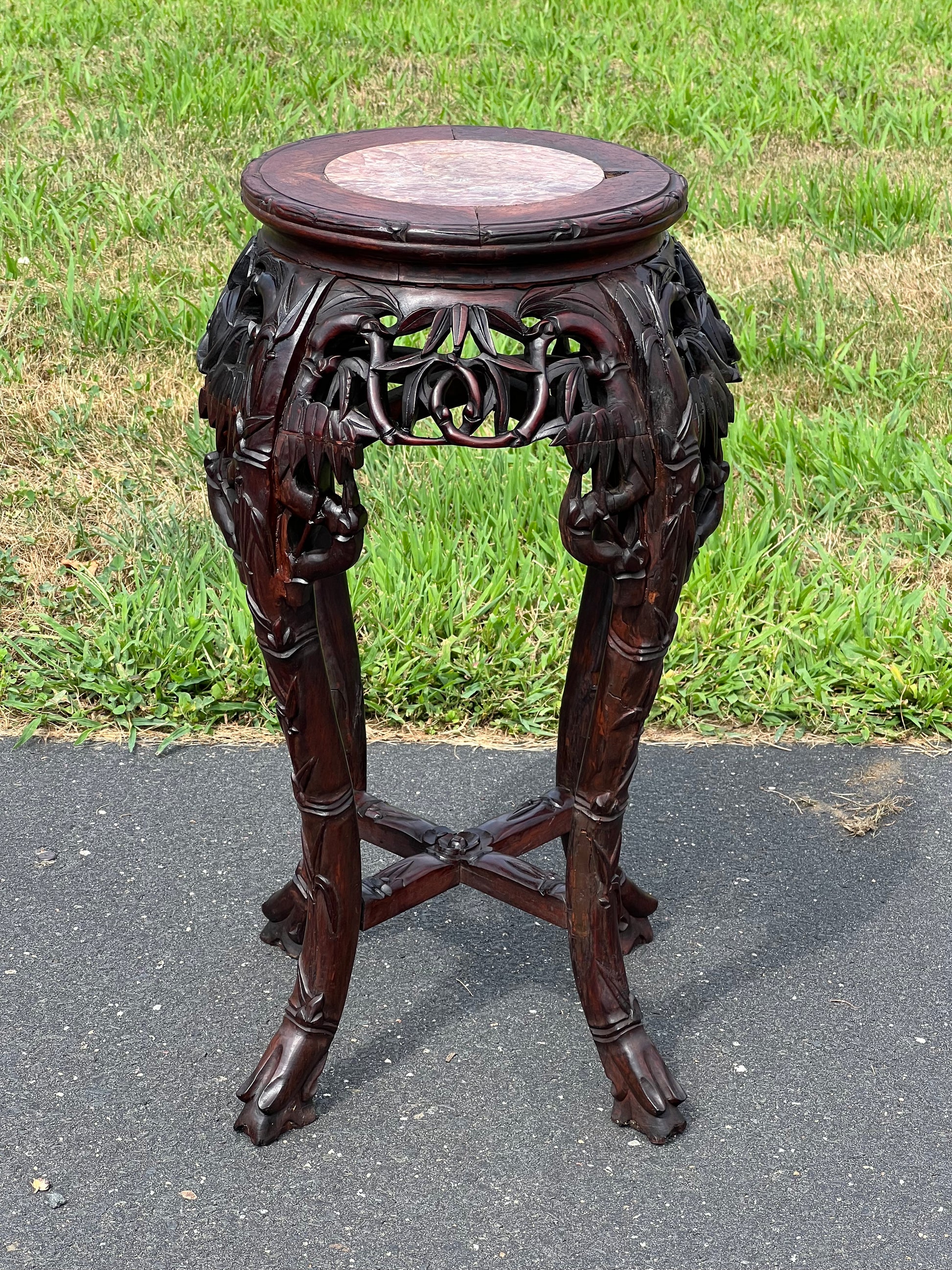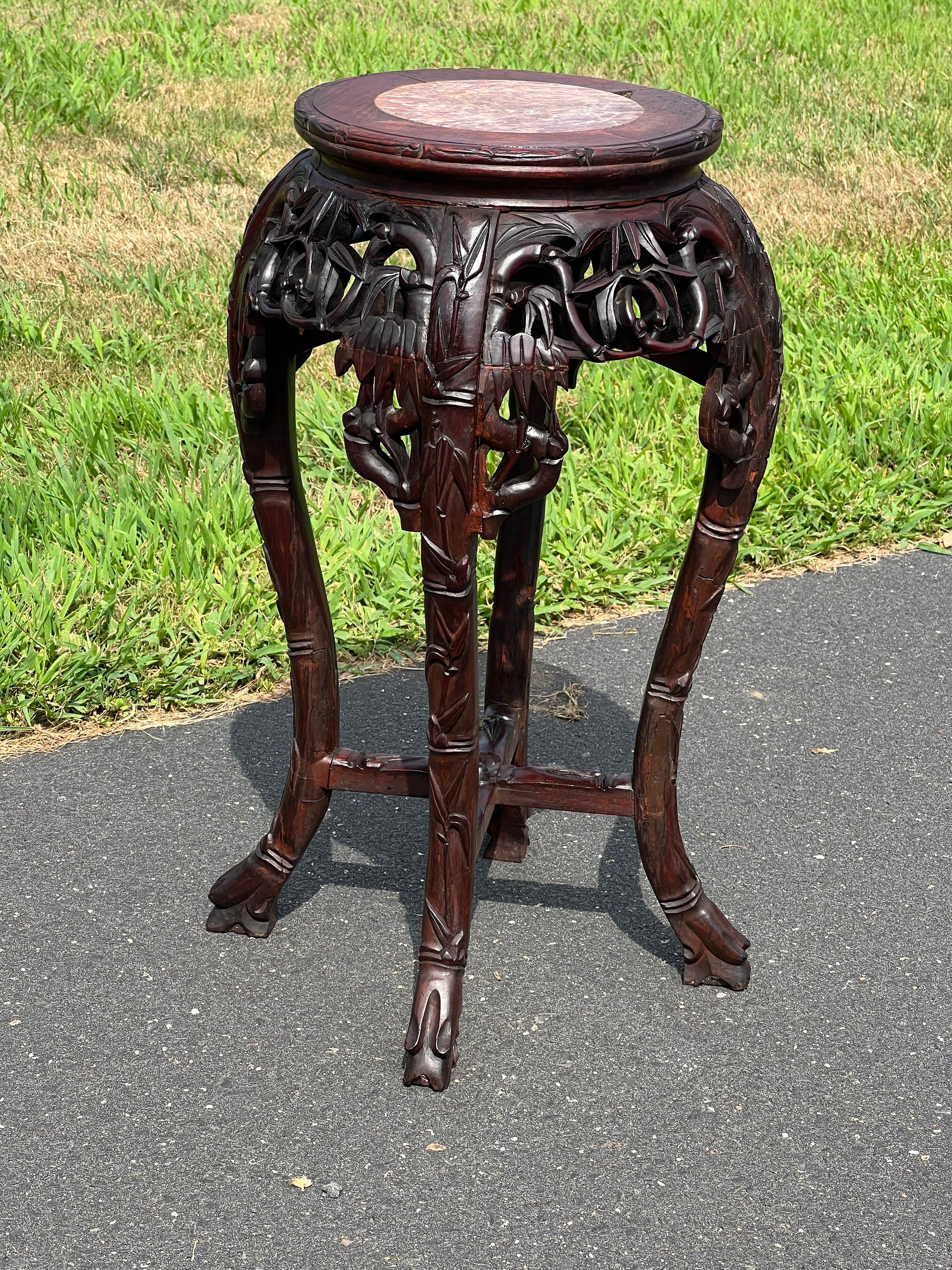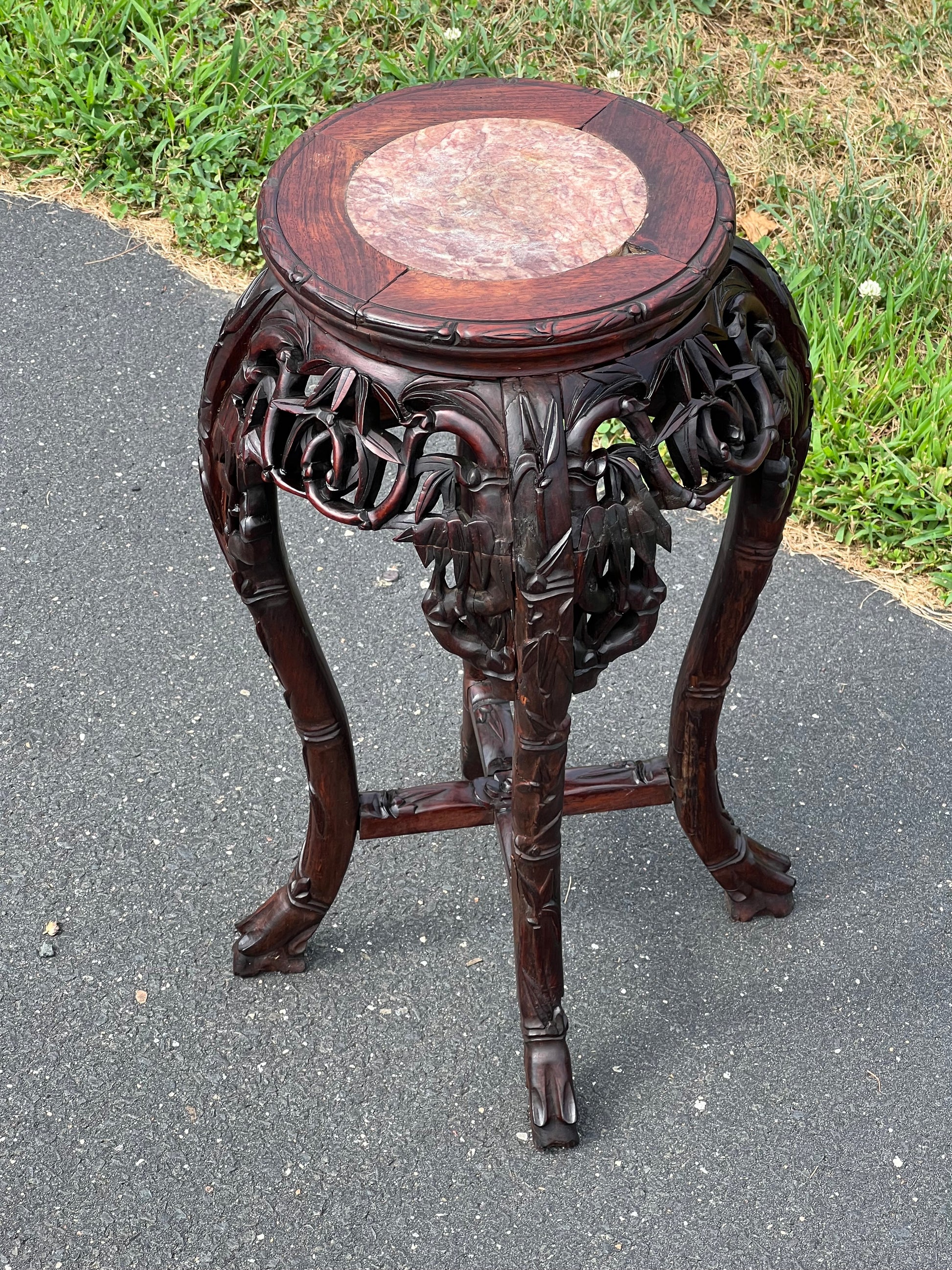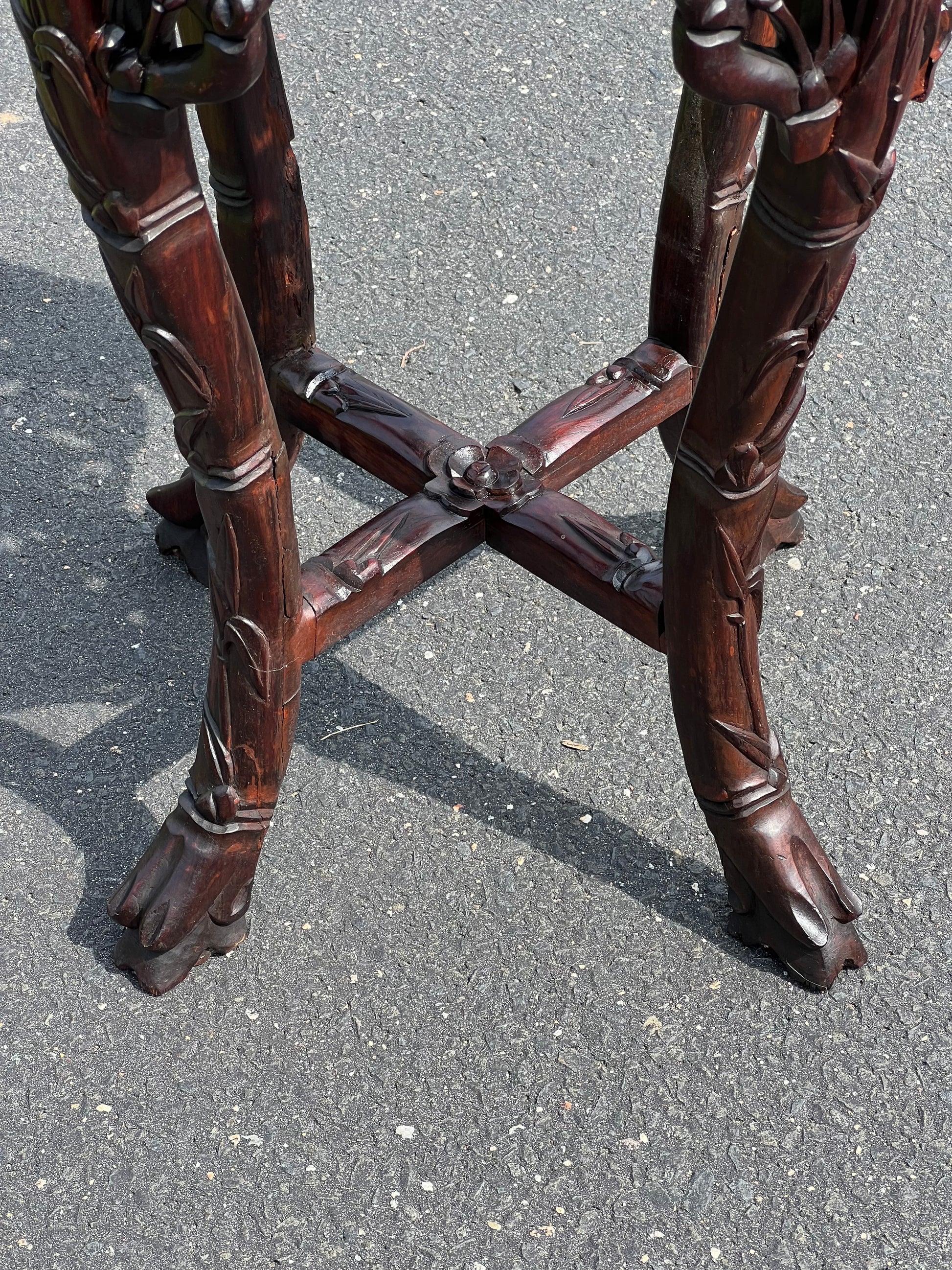 The elegance of the dark rosewood contrasts strikingly with the soft tone of the marble, making it a focal point in any room. The legs are sculpted into graceful shapes that mimic natural forms and creatures, adding to its ornate character. This plant stand not only serves as a functional piece of furniture but also as a remarkable artifact of Asian decorative art. 24h x 13w x 13d