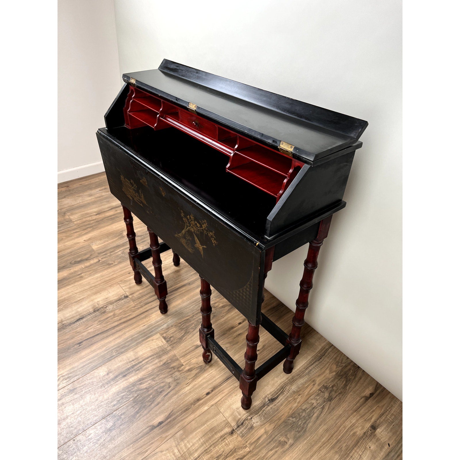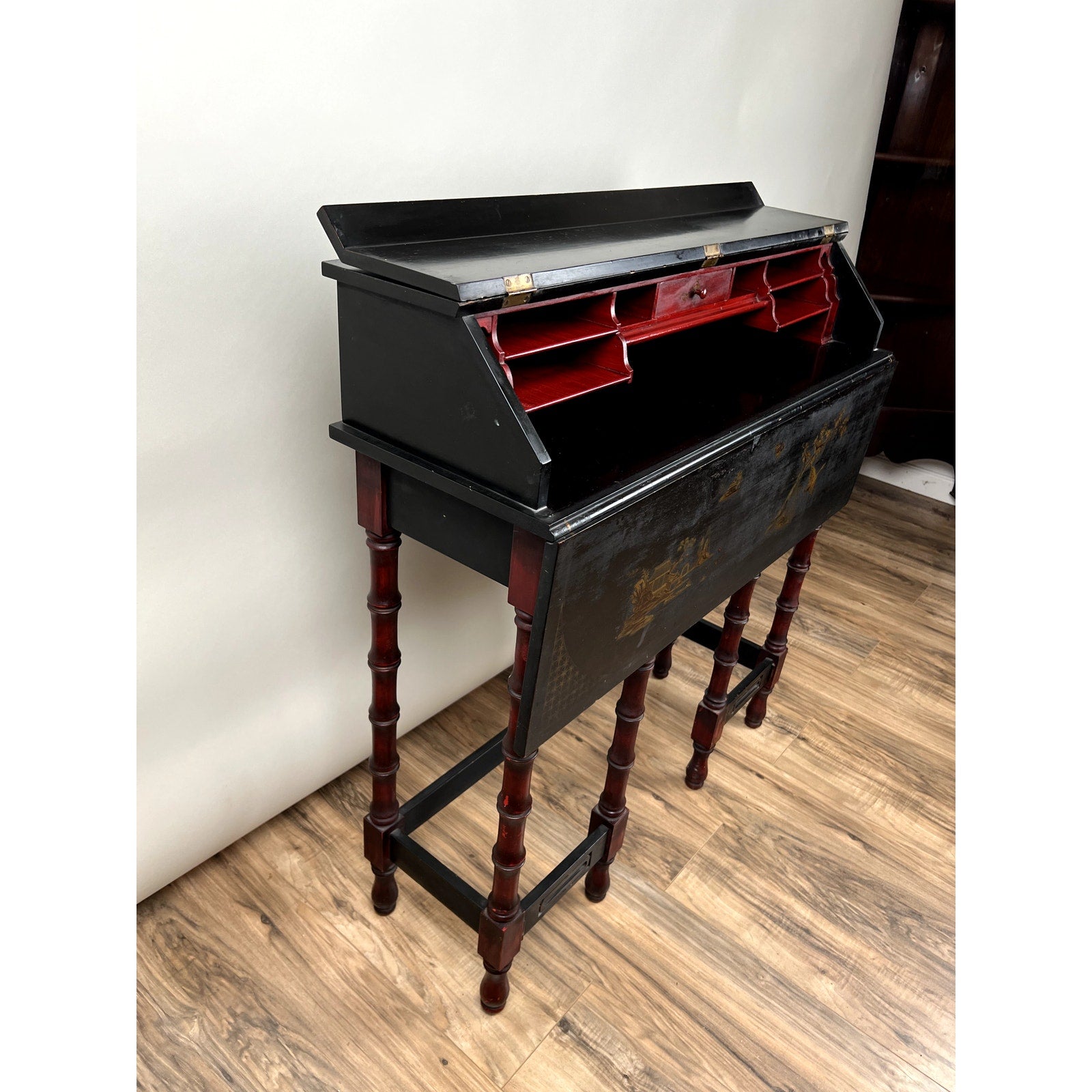 The desk features a flared, cylindrical leg design, painted in a contrasting rich red to complement the lacquered black finish, adding depth and visual interest. The drop-down desk surface opens to reveal a gorgeous red-painted interior, complete with compartments for organization, including a small drawer. Two gate legs swing out to provide additional support for the writing surface, enhancing its practical functionality. The overall aesthetic speaks to the Arts and Crafts period, with a unique blend of style and craftsmanship.