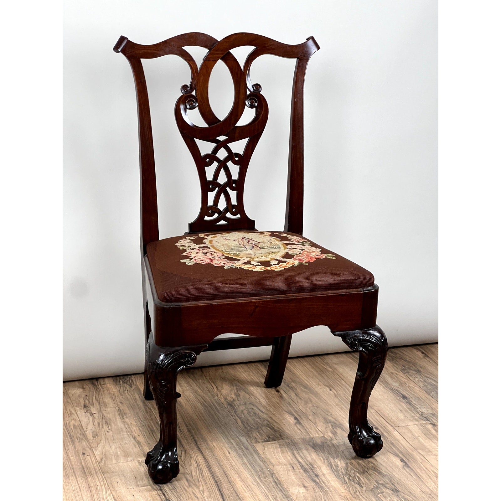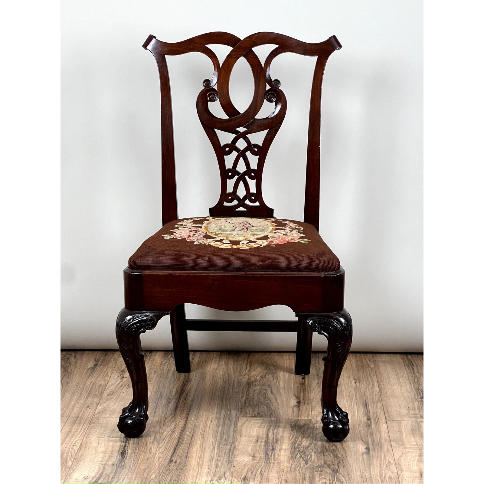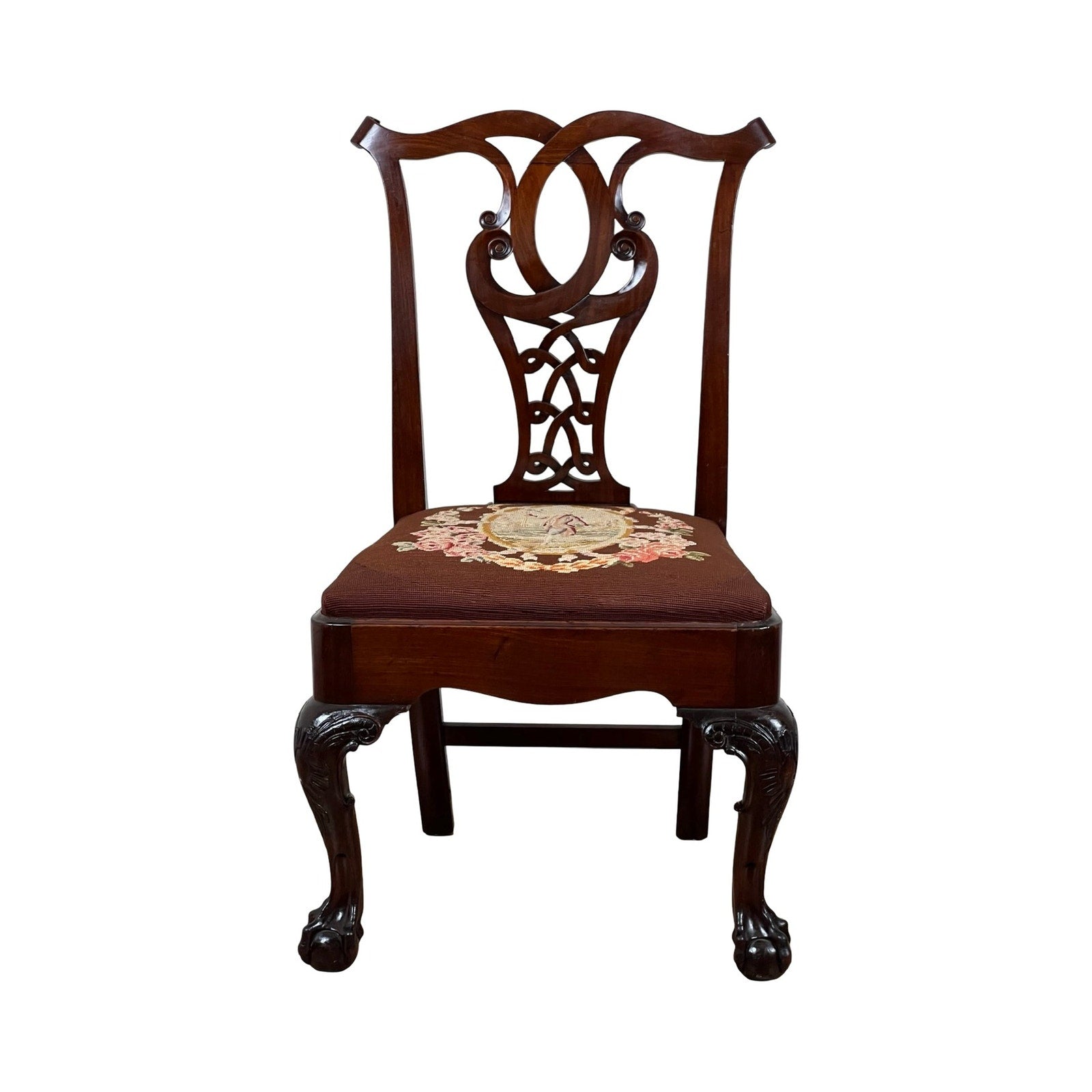 The chair stands on bold cabriole legs carved with acanthus leaf motifs that transition into tight ball and claw feet—a hallmark of the Chippendale vocabulary. The wide slip seat is upholstered in a deep burgundy tapestry featuring a central cartouche surrounded by floral sprays, likely hand-stitched and original to the chair or added not long after. The frame is solid and well-balanced, with warm patina and excellent grain visible throughout the mahogany.