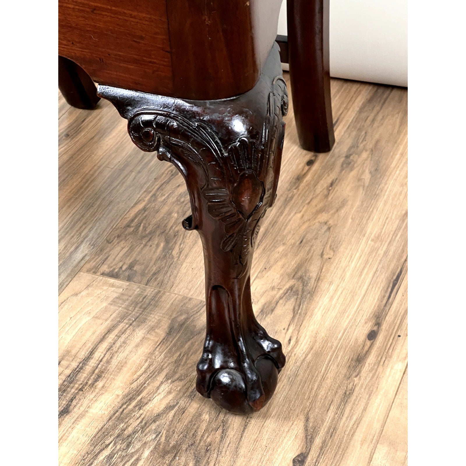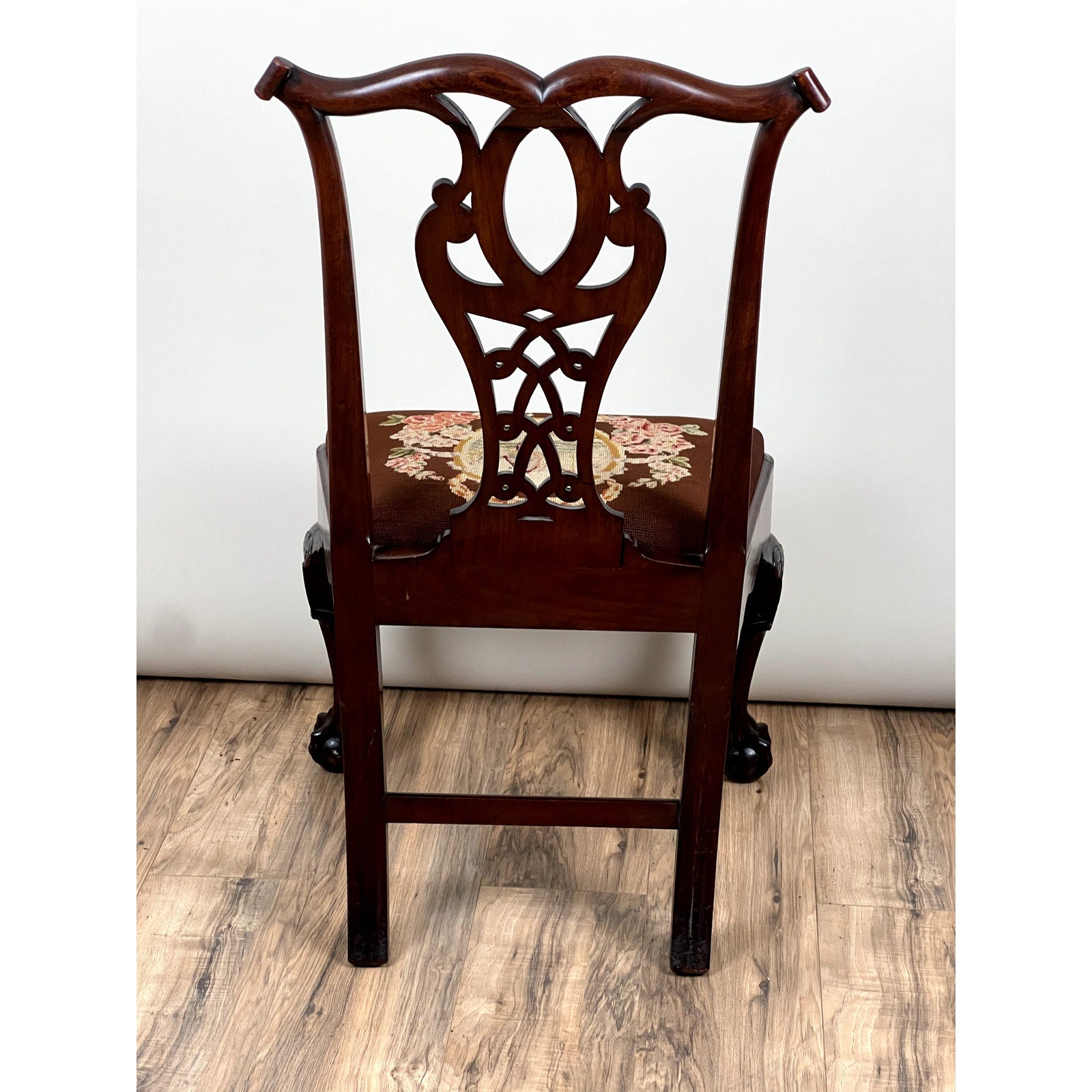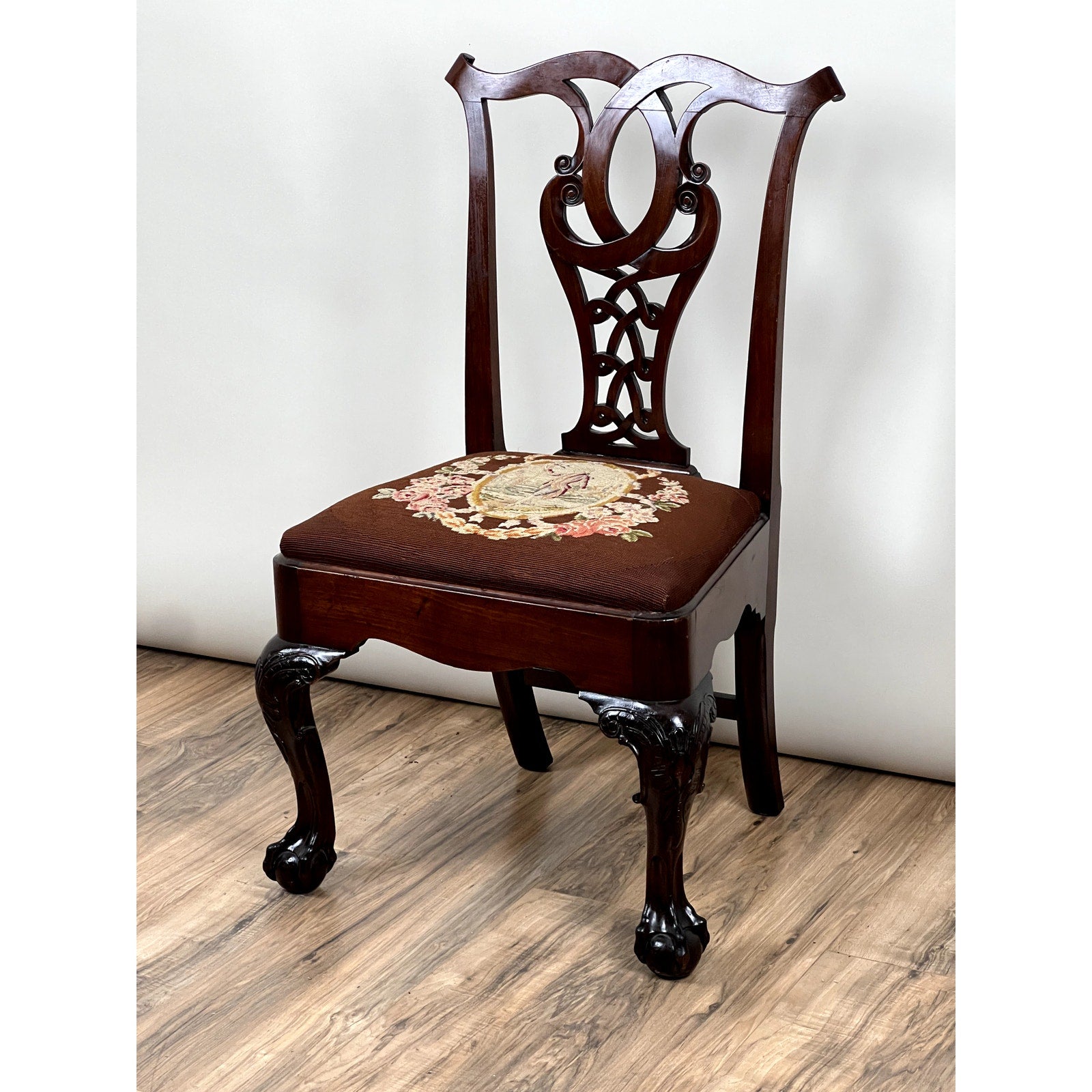 The chair stands on bold cabriole legs carved with acanthus leaf motifs that transition into tight ball and claw feet—a hallmark of the Chippendale vocabulary. The wide slip seat is upholstered in a deep burgundy tapestry featuring a central cartouche surrounded by floral sprays, likely hand-stitched and original to the chair or added not long after. The frame is solid and well-balanced, with warm patina and excellent grain visible throughout the mahogany.