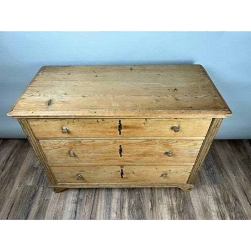 The chest’s three drawers are designed with basic wooden pulls, contributing to its utilitarian and functional design. The minimalism of the Biedermeier style is evident, with clean lines and very few decorative elements. The absence of stain or finish allows the wood’s natural texture and grain to shine through, lending the chest a timeless, rustic appeal.