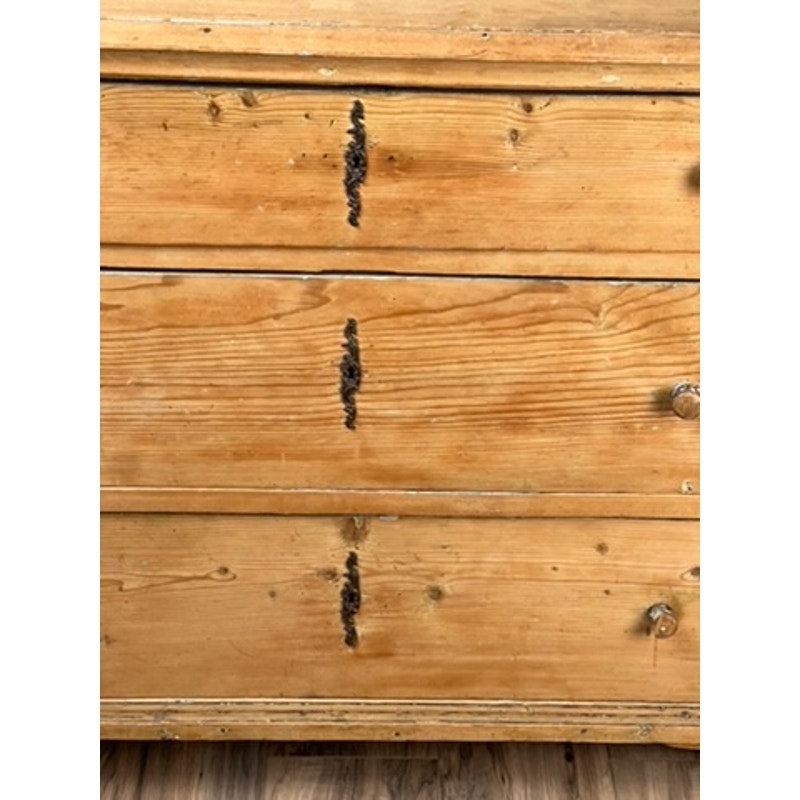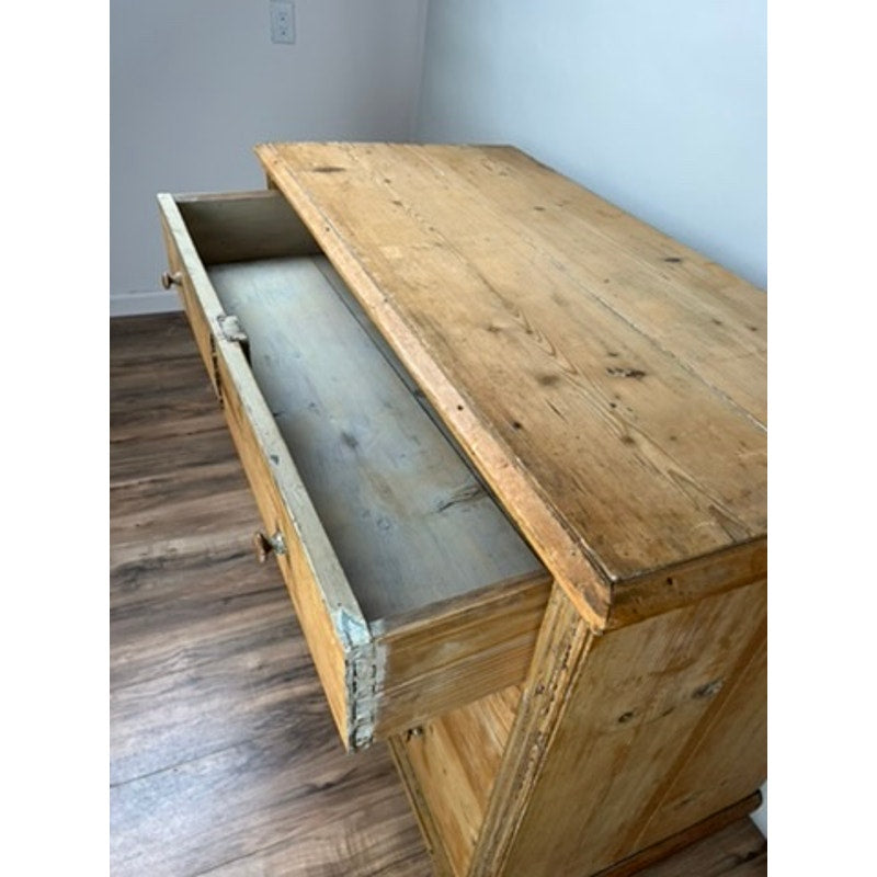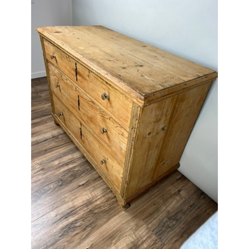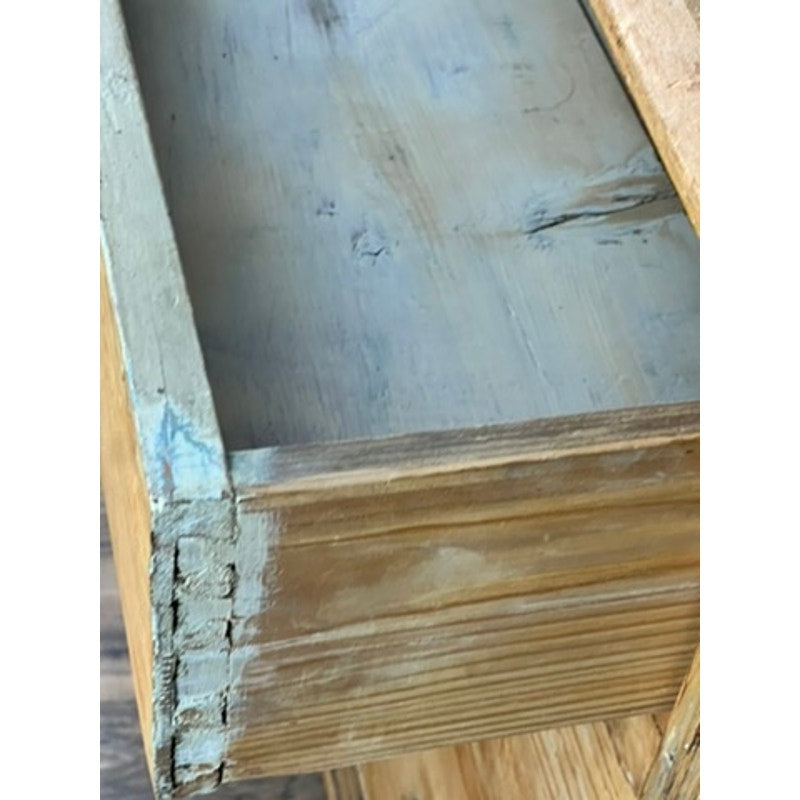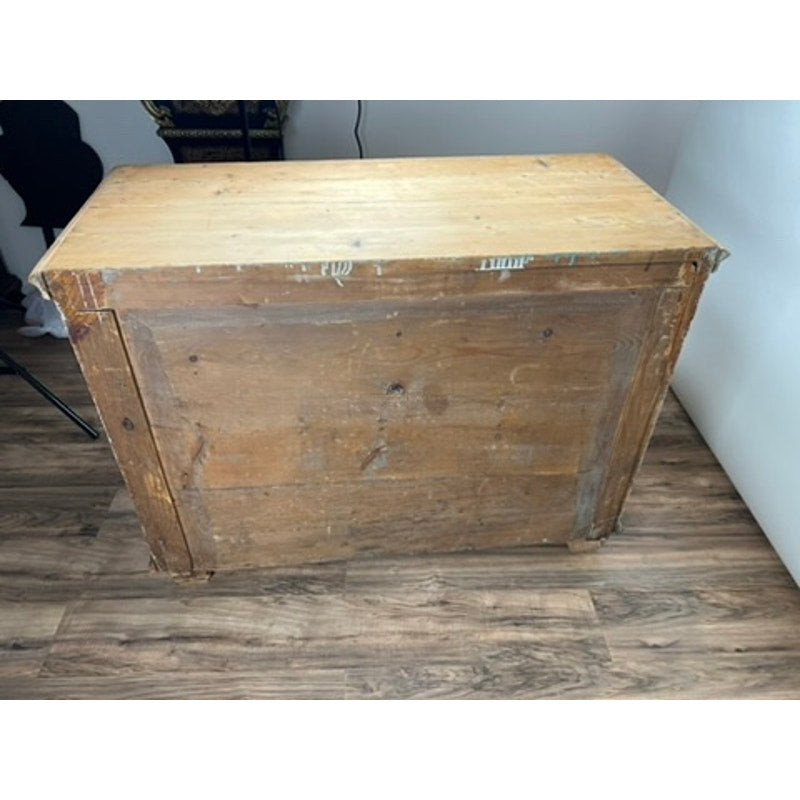 Despite the natural wear and patina from age, the piece is solid and functional, with drawers that operate smoothly. This chest offers a unique blend of history, practicality, and raw beauty, making it an ideal addition for those who appreciate a more organic and understated aesthetic. The traces of earlier paint and the raw finish tell a story, making this chest not just a functional piece, but a conversation starter as well.