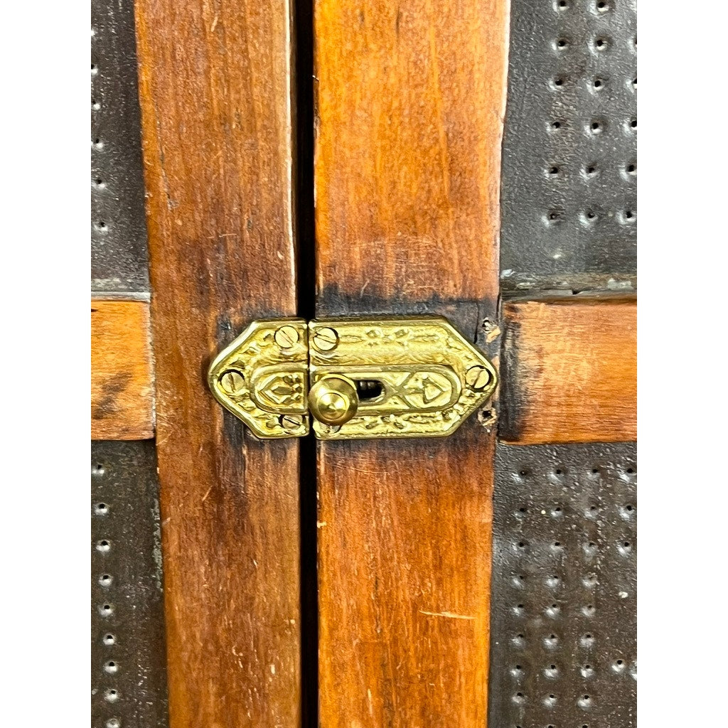 This Antique Country Pine and Punched Tin Pie Safe, c. Early 19th Century, is a charming example of utilitarian folk furniture designed for functionality as much as for beauty. The piece features a pair of pierced tin doors that are not only visually interesting but serve the practical purpose of allowing air circulation for preserving pies and other food items, a common use during the era. The punched tin panels are adorned with simple yet elegant star-shaped motifs, reflecting the artisan craftsmanship typical of rural American furniture of the period.