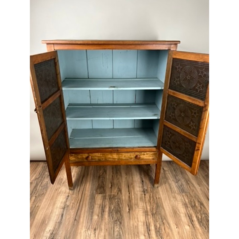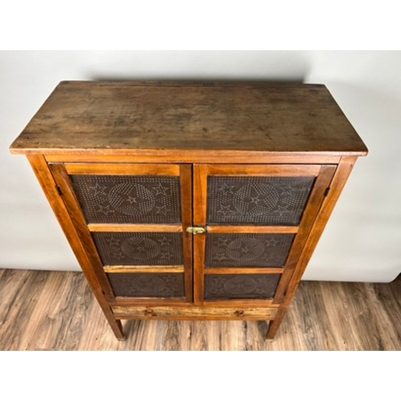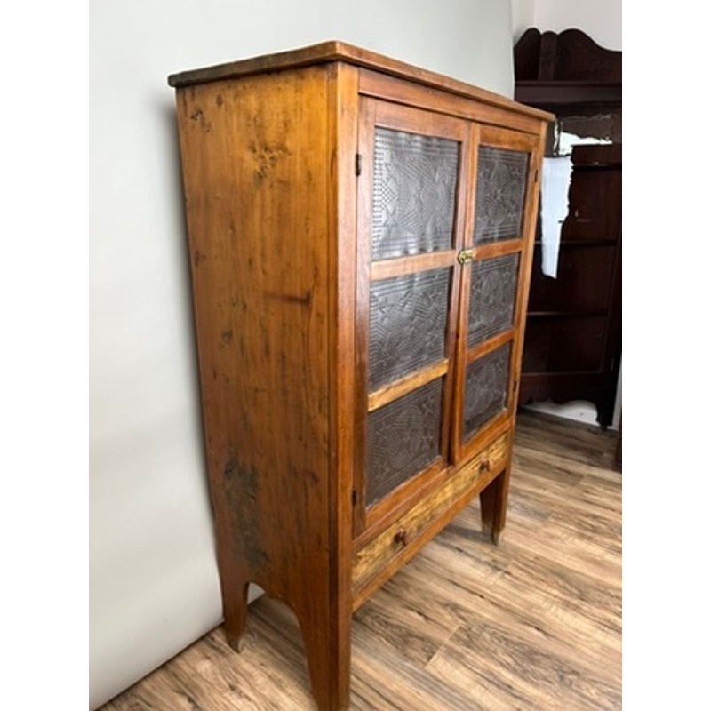 Constructed from pine, the cabinet retains the warm, honey-toned patina of the wood, enhanced by its age and use. The wood has aged gracefully, showing the natural grains and texture that make pine so desirable in rustic furniture. Below the tin doors, a single drawer is positioned, offering additional storage space for kitchen essentials, while the piece stands on four simple legs that give it a lightweight, yet sturdy presence.