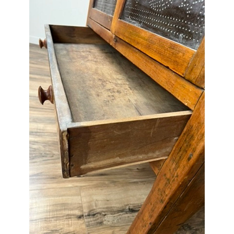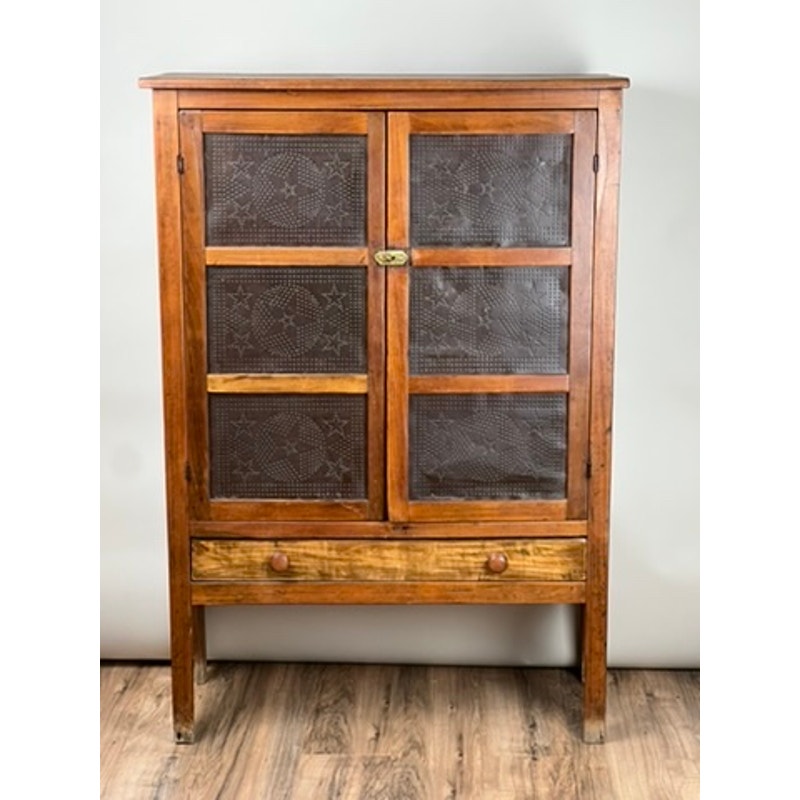 This pie safe is in very good, structurally sound condition, with only light wear appropriate for its age. The drawer pulls are simple wooden knobs, adding to the rustic charm of the piece. While the punched tin doors remain an attractive feature, they also highlight the practical history of the safe, providing a glimpse into the past when such furniture played a vital role in everyday life. The cabinet’s aesthetic appeal, combined with its historical function, makes it a standout addition to any collection of American country antiques. 57h x 39w x 17d