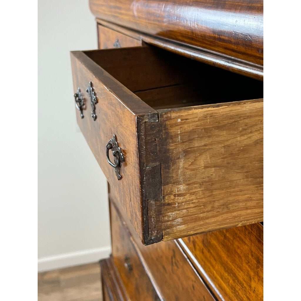 Step back in time with this Antique William & Mary highboy from the early 18th century, a true testament to the craftsmanship and style of its era. Constructed from rich, deeply patinated wood, this highboy features intricate brass pulls on each of its multiple drawers, which provide ample storage while adding a touch of elegance. The fine detailing and original finishes reflect the period’s aesthetic and the artisan’s skilled hand.