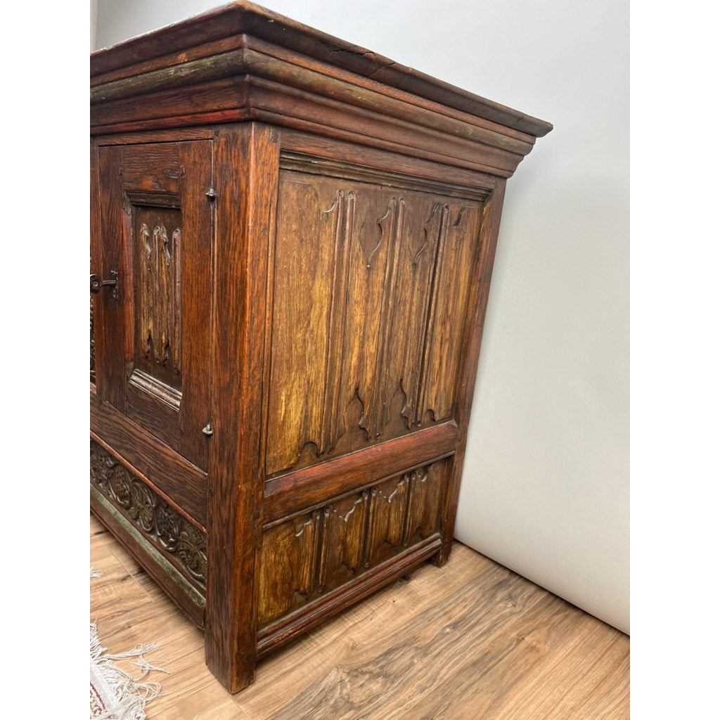 The cabinet remains in good antique condition, with some minor signs of wear and use expected with its age. These details add authenticity and character, making it a standout addition to any room. Whether used as a sideboard, storage, or simply as a decorative statement piece, this cabinet embodies the charm and elegance of English ecclesiastical furniture. 30h x45w x 21d