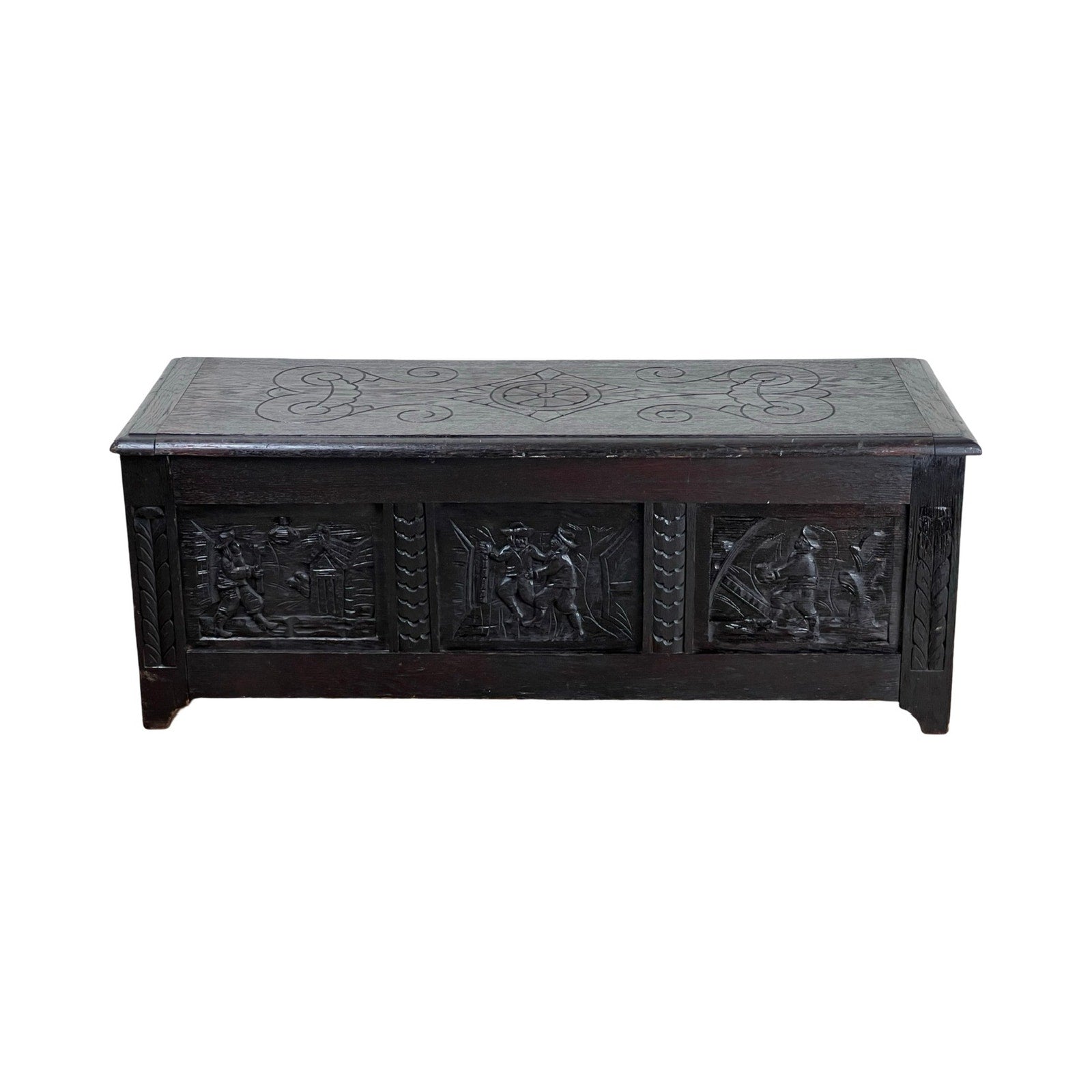 Jacobean-style furniture saw a resurgence in Victorian England, admired for its connection to craftsmanship and the romanticized rural life of earlier centuries. This coffer embodies that appreciation, combining sturdy joinery with decorative ambition. The carved figures and architectural backgrounds tell a story in relief — a testament to the Victorian fascination with history and handwork.