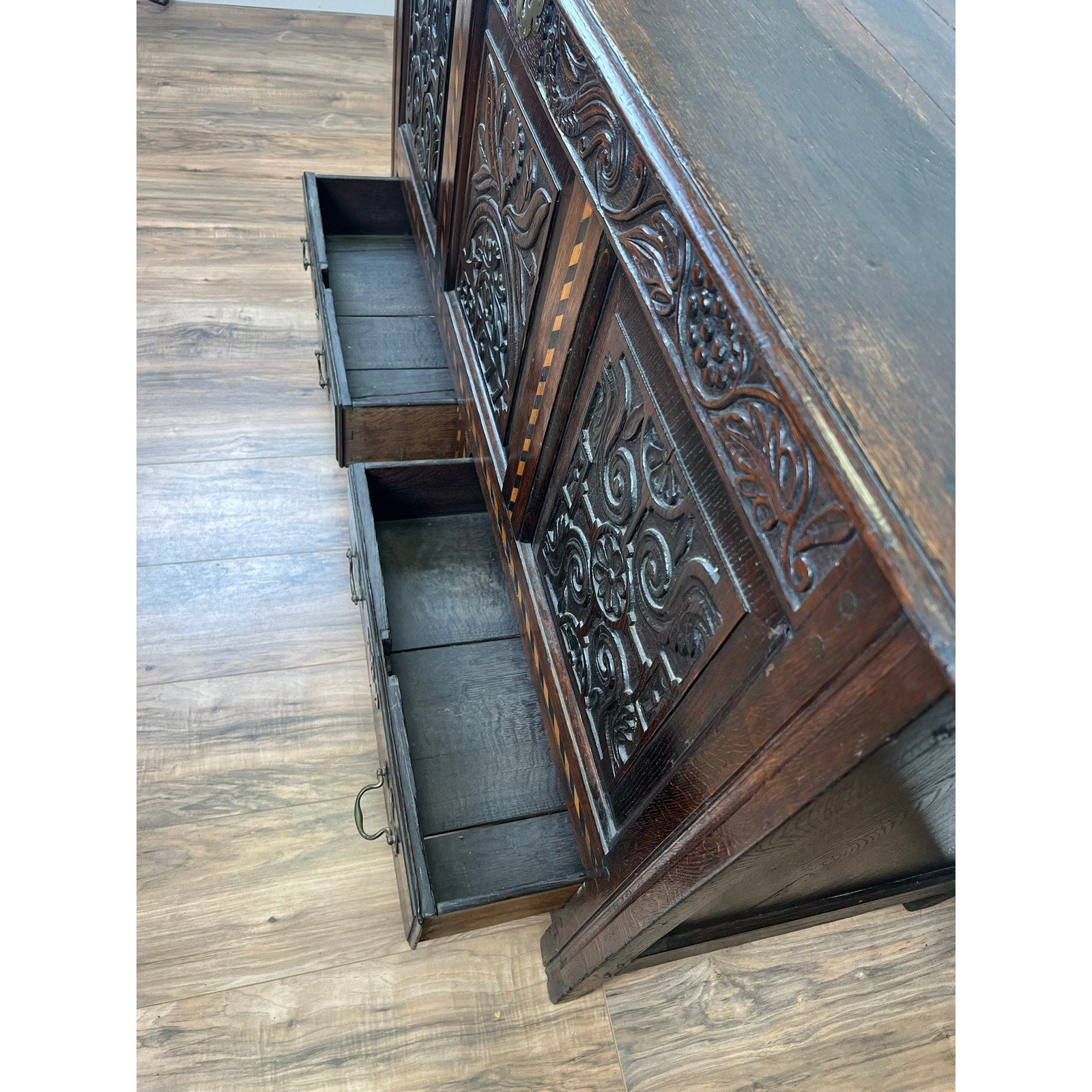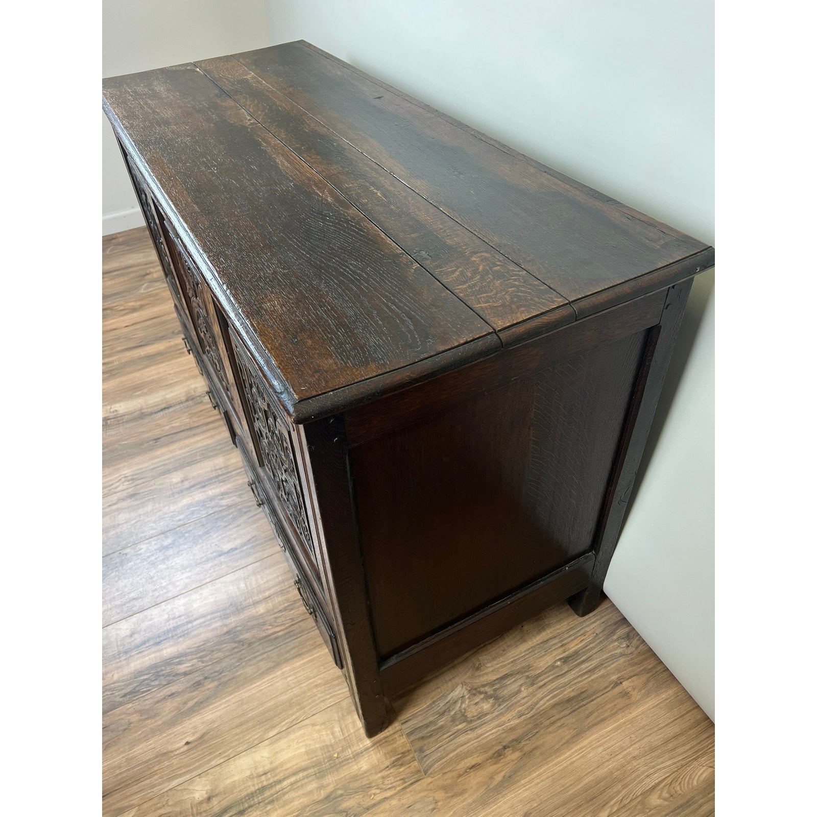 This Antique English Oak Mule Chest, dating to 1677, is a remarkable example of 17th-century craftsmanship, showcasing intricate carvings and distinctive design features. The chest’s sturdy oak construction has developed a beautiful patina over the years, with deeply carved panels that feature floral and scrollwork motifs. The center panel is particularly striking, with a detailed design of flowers and foliage, dated 1677, making this chest not only a functional piece but a historical artifact as well.