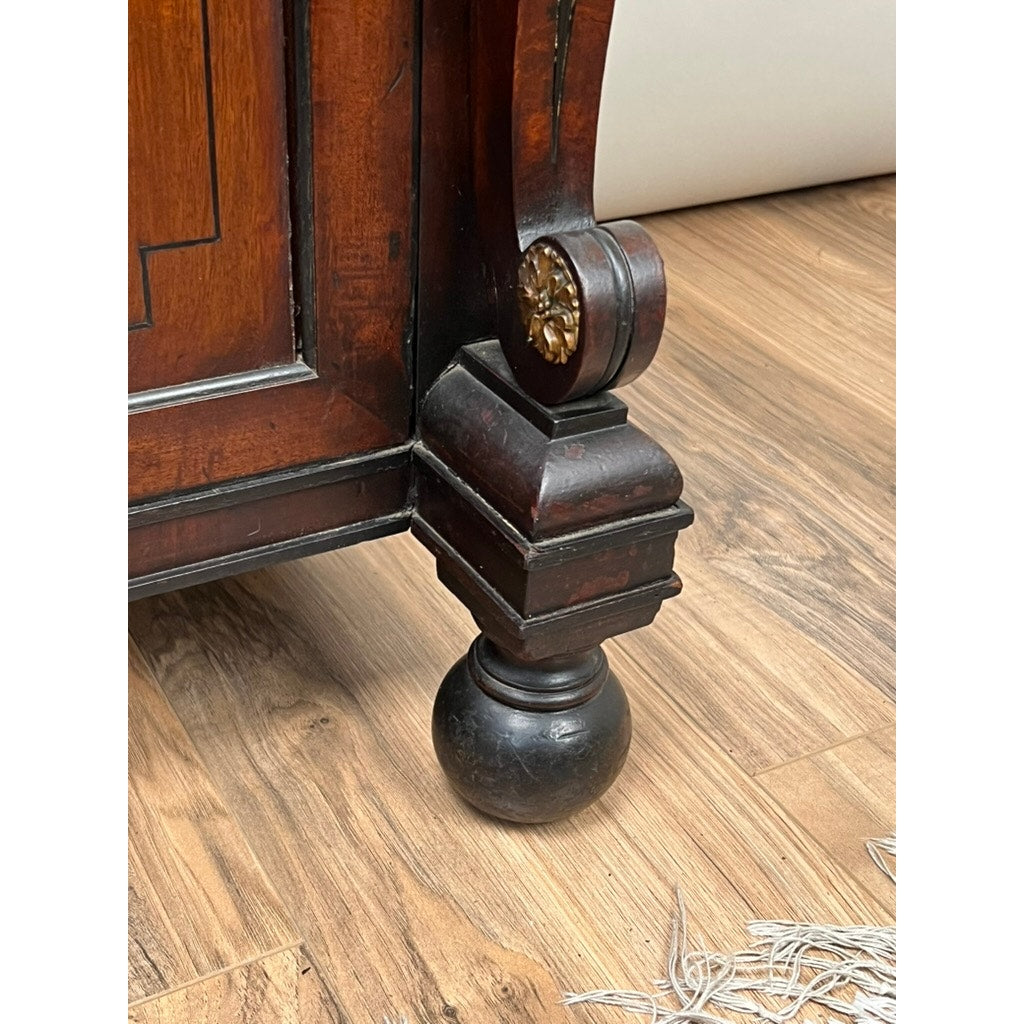 The central writing surface is concealed within a hinged fold-down desk, which reveals a fitted interior with small compartments and drawers. Below, the two cabinet doors, adorned with meticulously outlined paneling, open to reveal ample storage space. The piece is supported by gracefully tapering side columns with applied giltwood foliate carvings and terminates in robust ball feet, lending it both stability and visual impact.