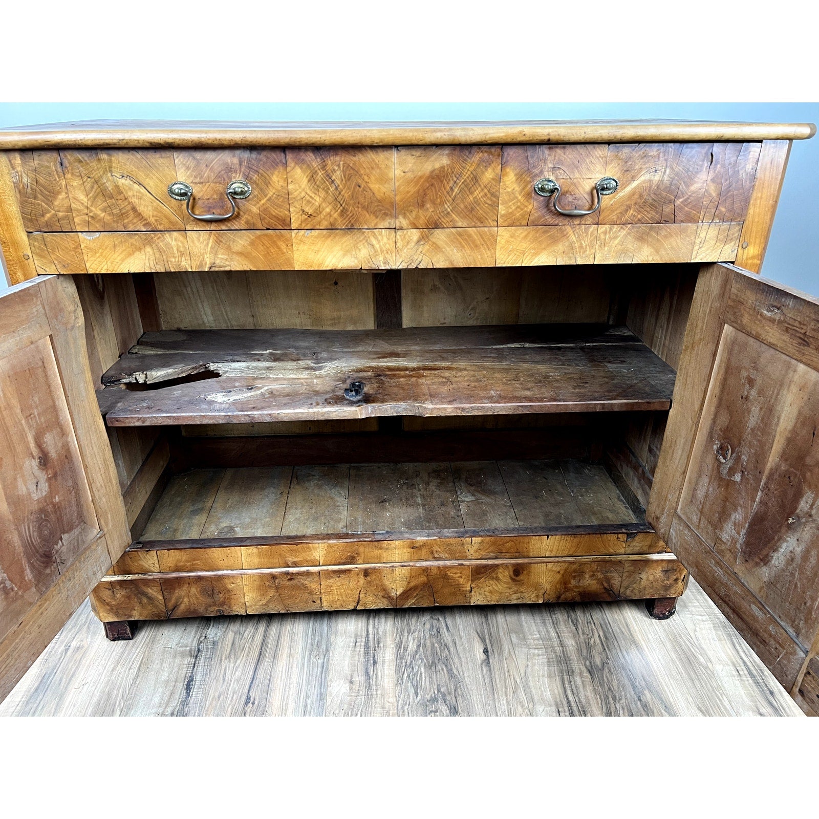 In nice antique condition with wear consistent with age and use. There are minor scuffs, light surface blemishes, and subtle irregularities to the veneer—all part of the character of a well-aged piece. The end grain detail is remarkably well preserved and clearly visible in the photos. Structurally sound and visually distinctive, this buffet is a wonderful example of how even modest furniture from the Biedermeier era can express exceptional craftsmanship and natural beauty. 40h x 51w x 22d