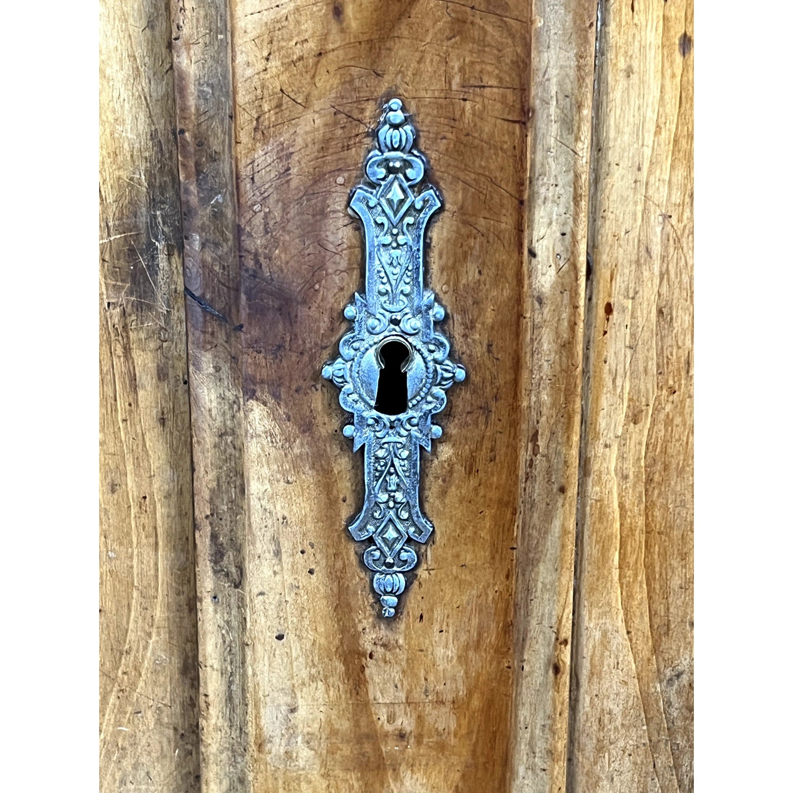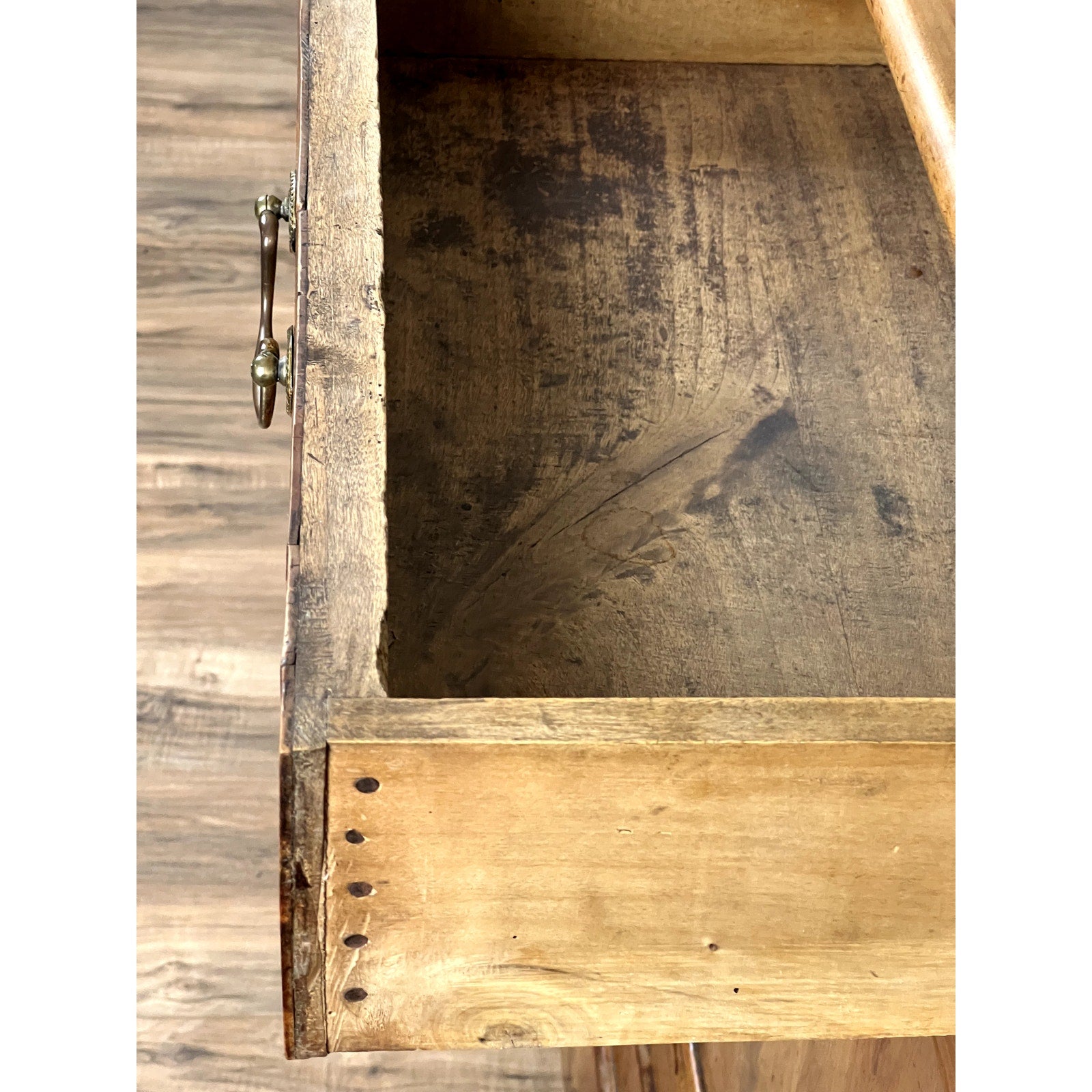 The case is arranged in a clean two-over-two layout, with a pair of upper drawers over paneled cabinet doors. While the brass drawer pulls are later replacements, they suit the period aesthetic nicely and function well. A decorative escutcheon adds a touch of ornament, while the stepped top molding and substantial base offer a sense of quiet gravitas. Inside, a full-width shelf provides practical storage, making this a versatile choice for dining, entry, or living room use. The warm golden tones of the fruitwood complement both rustic and more formal interiors with ease.