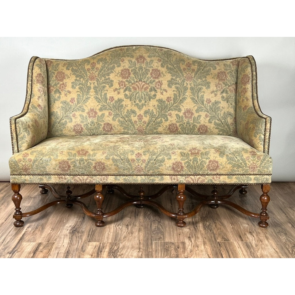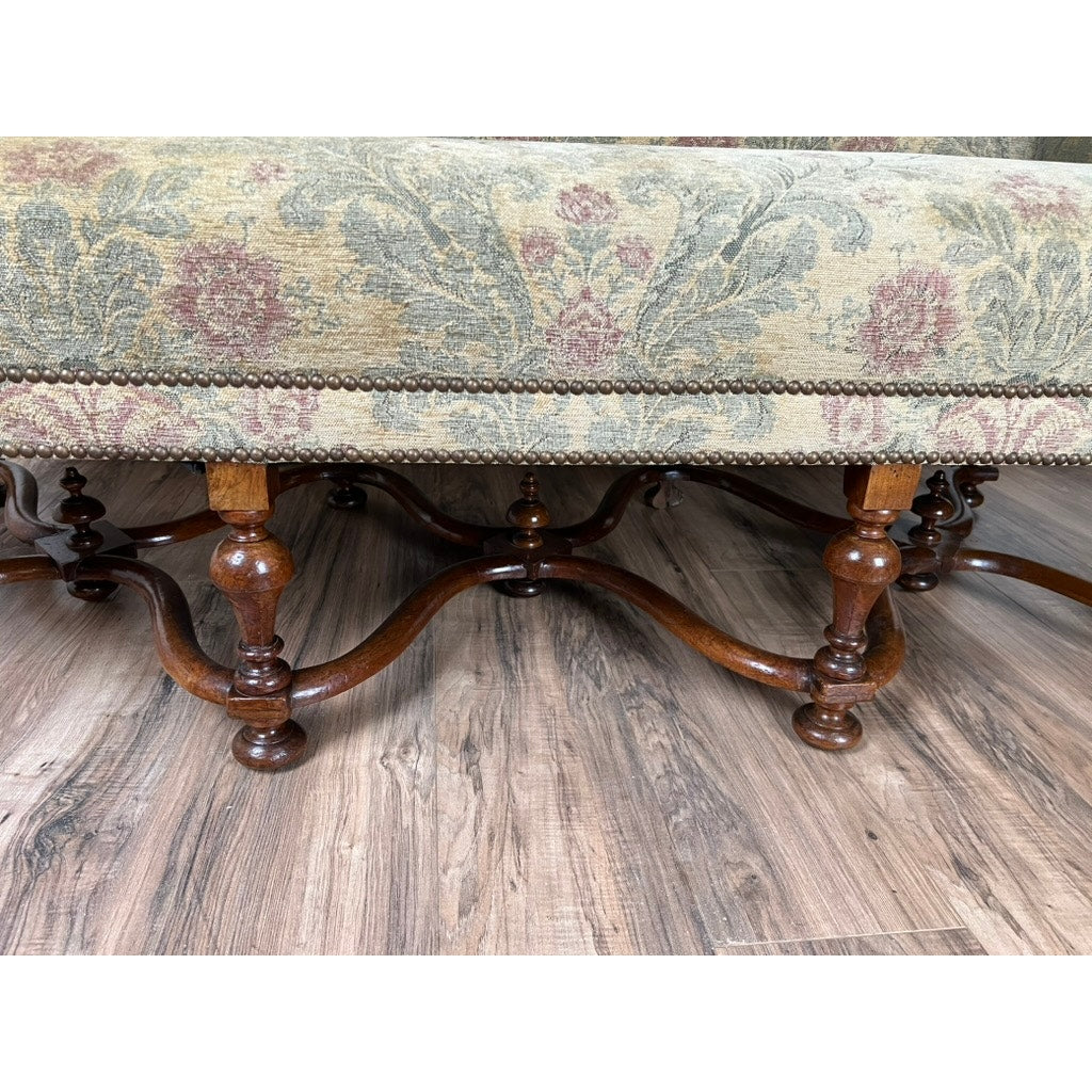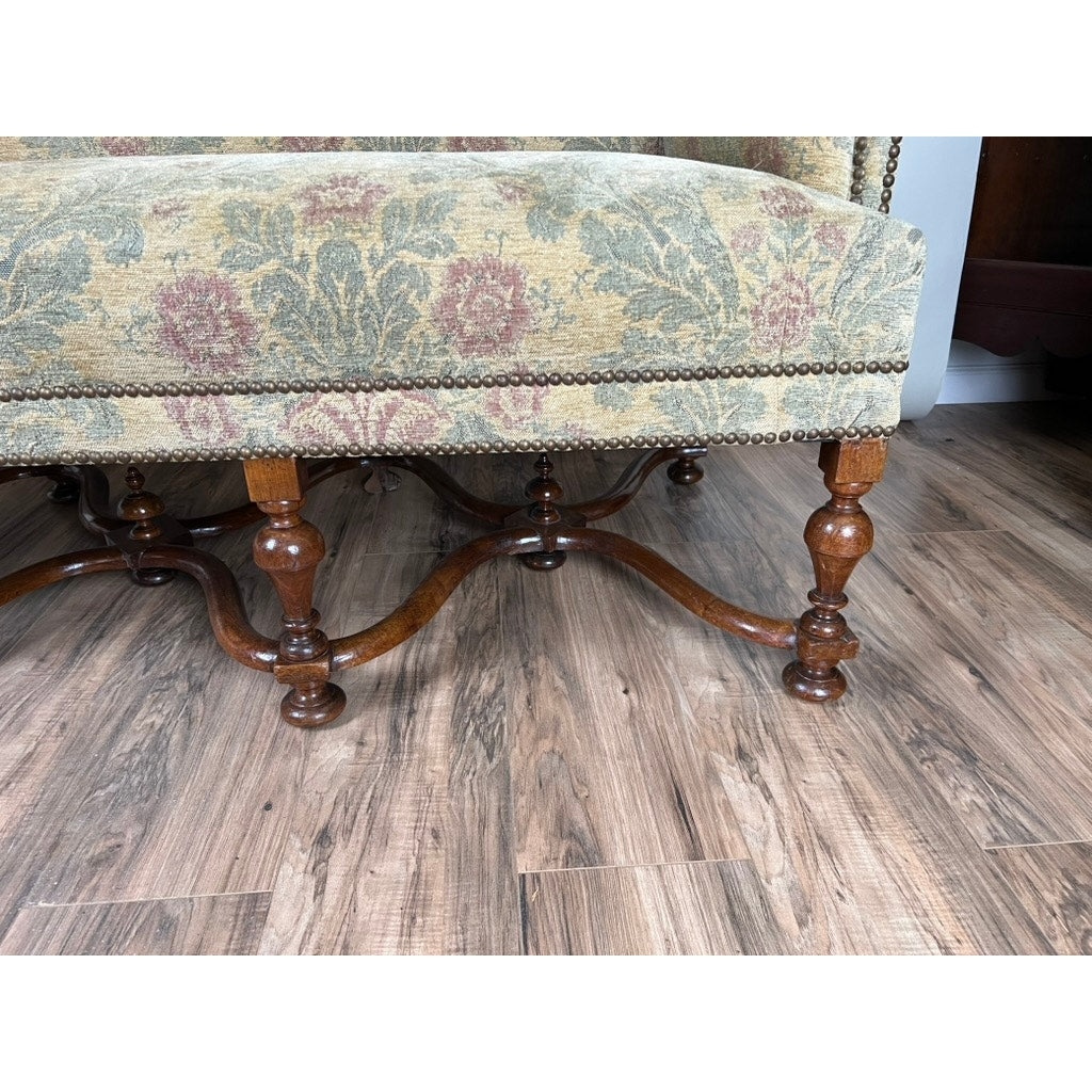 The wooden base is constructed from rich walnut, featuring carved details that nod to the grandeur of the Louis XIV period. The turned legs and intricately carved stretchers give the settee a sense of elegance and sturdiness, making it not only a beautiful focal point but also a functional, enduring piece for any traditional or transitional home.