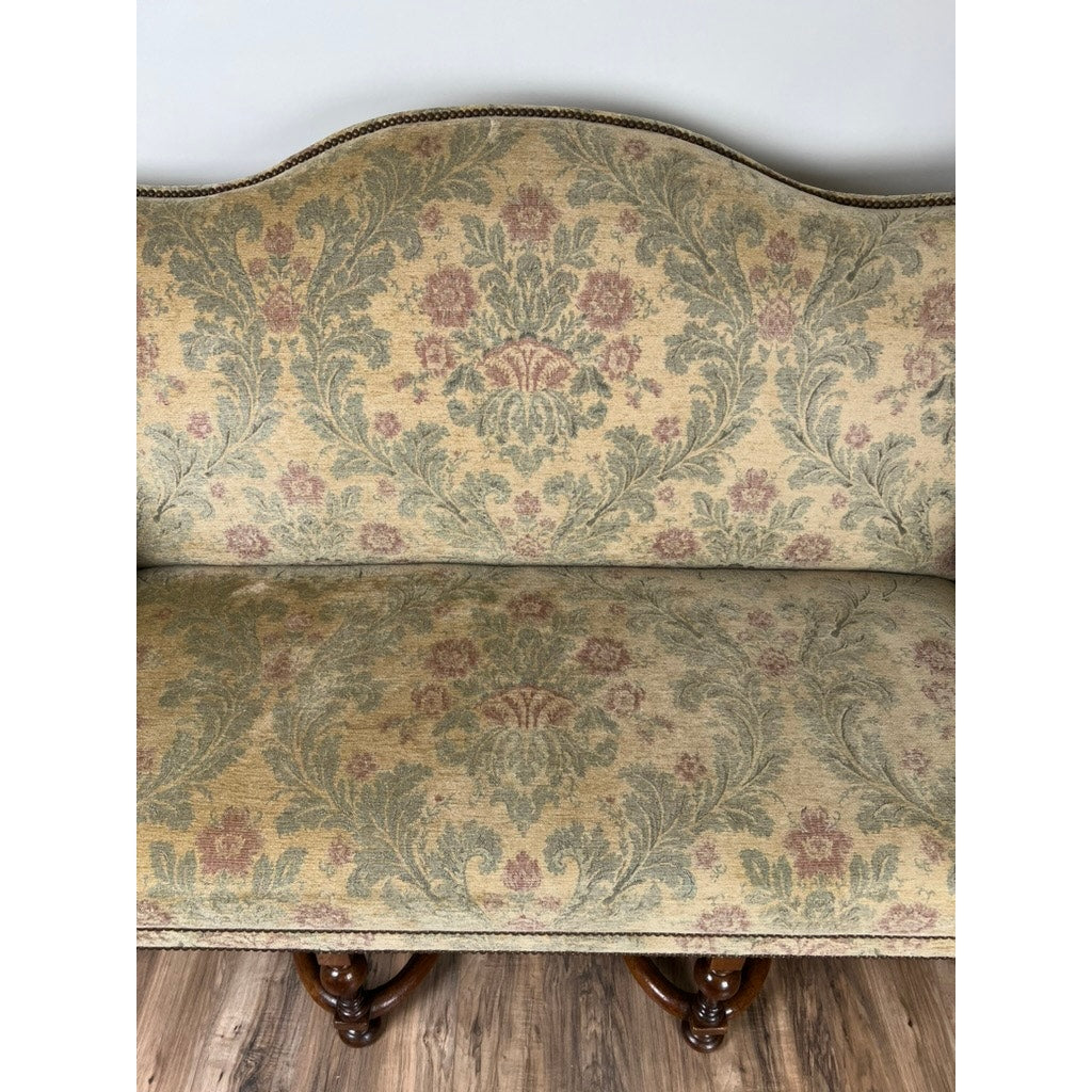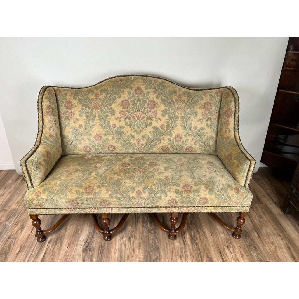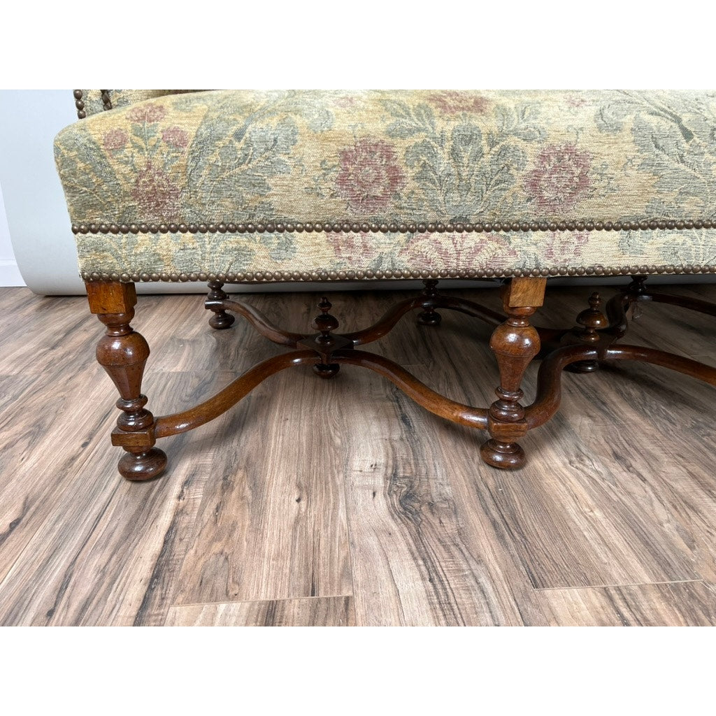 The wooden base is constructed from rich walnut, featuring carved details that nod to the grandeur of the Louis XIV period. The turned legs and intricately carved stretchers give the settee a sense of elegance and sturdiness, making it not only a beautiful focal point but also a functional, enduring piece for any traditional or transitional home.