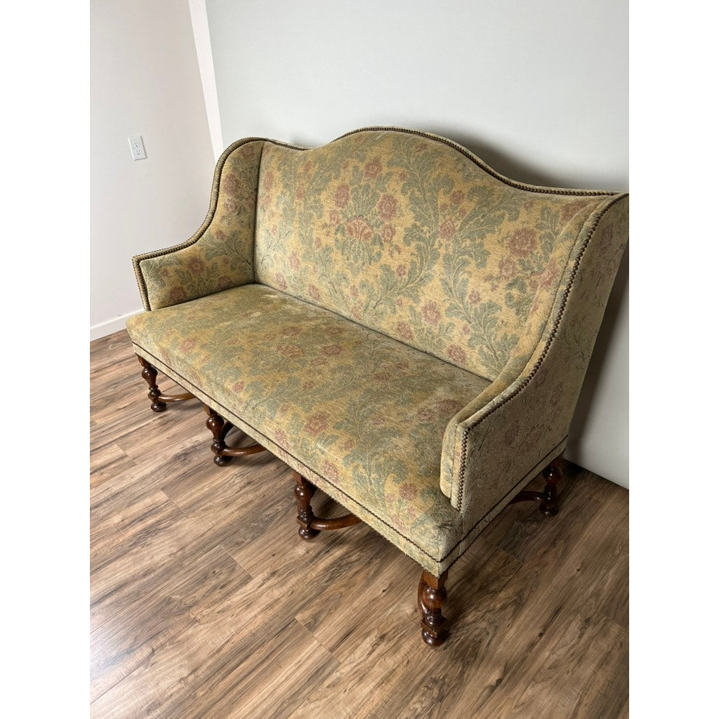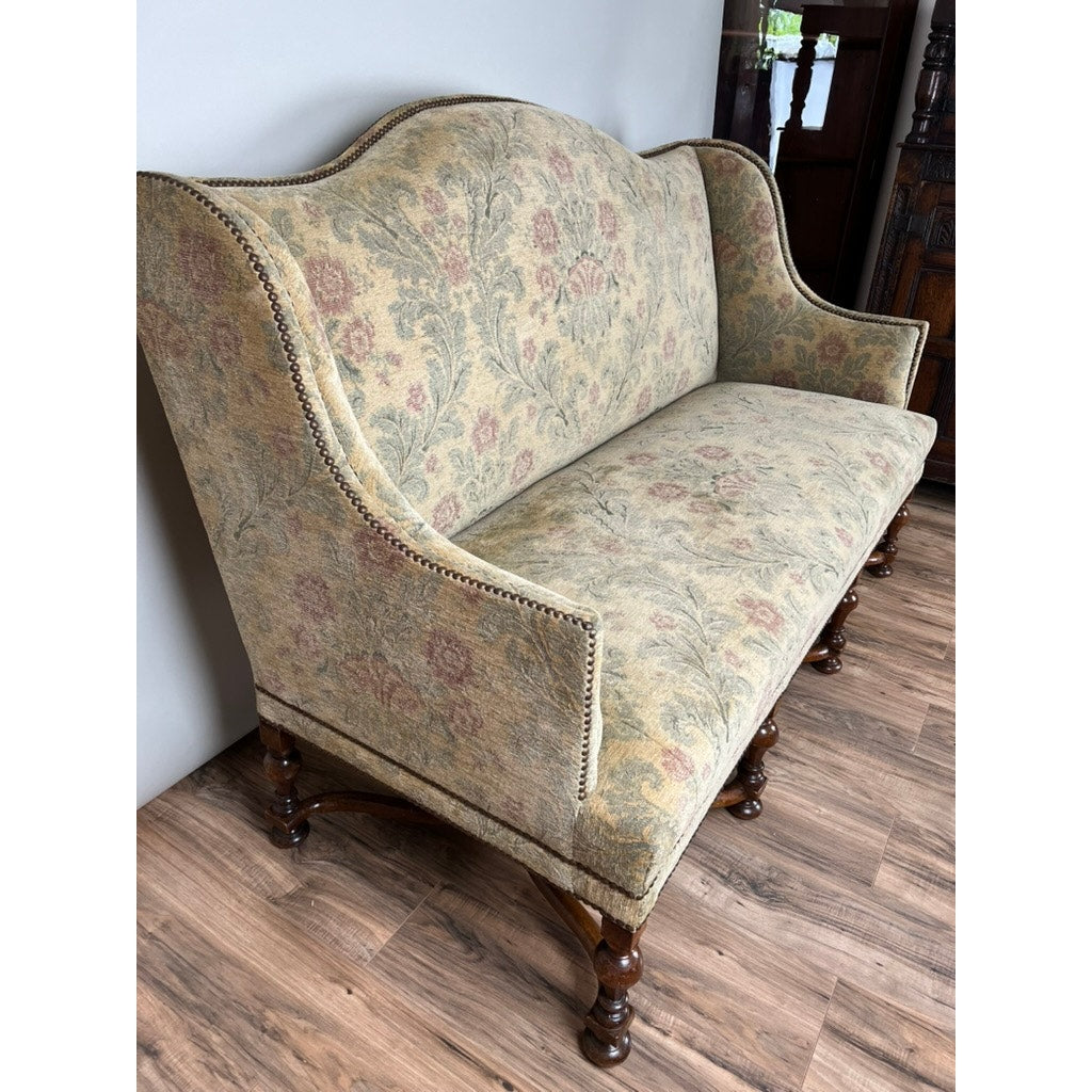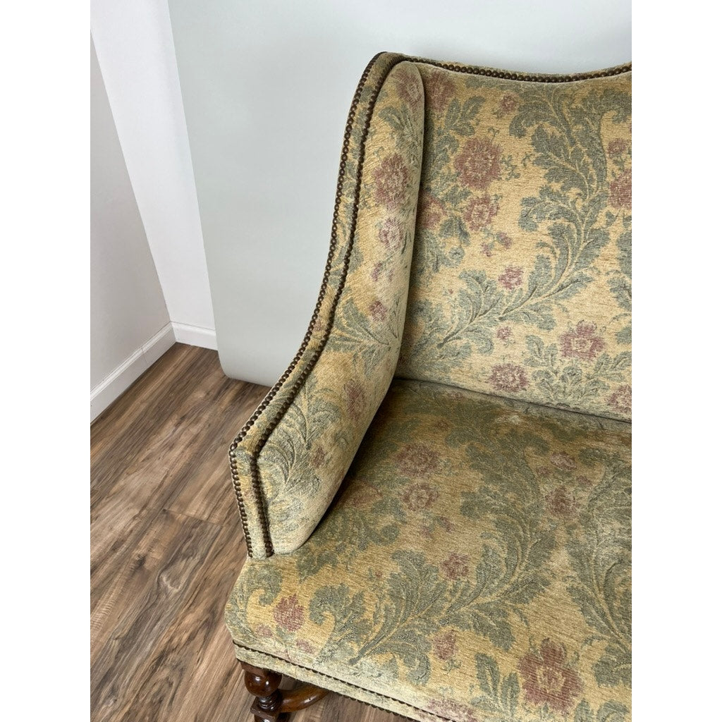 This Antique French Louis XIV Style Highback Settee, dating back to the late 19th century, is a stunning example of neoclassical design. The settee’s high, curved back provides a stately and supportive seating area, while the sumptuous floral fabric in soft shades of green and rose brings a touch of opulence to any space. The upholstery is finished with elegant brass nailhead trim, accentuating its graceful lines and adding visual interest to the piece.