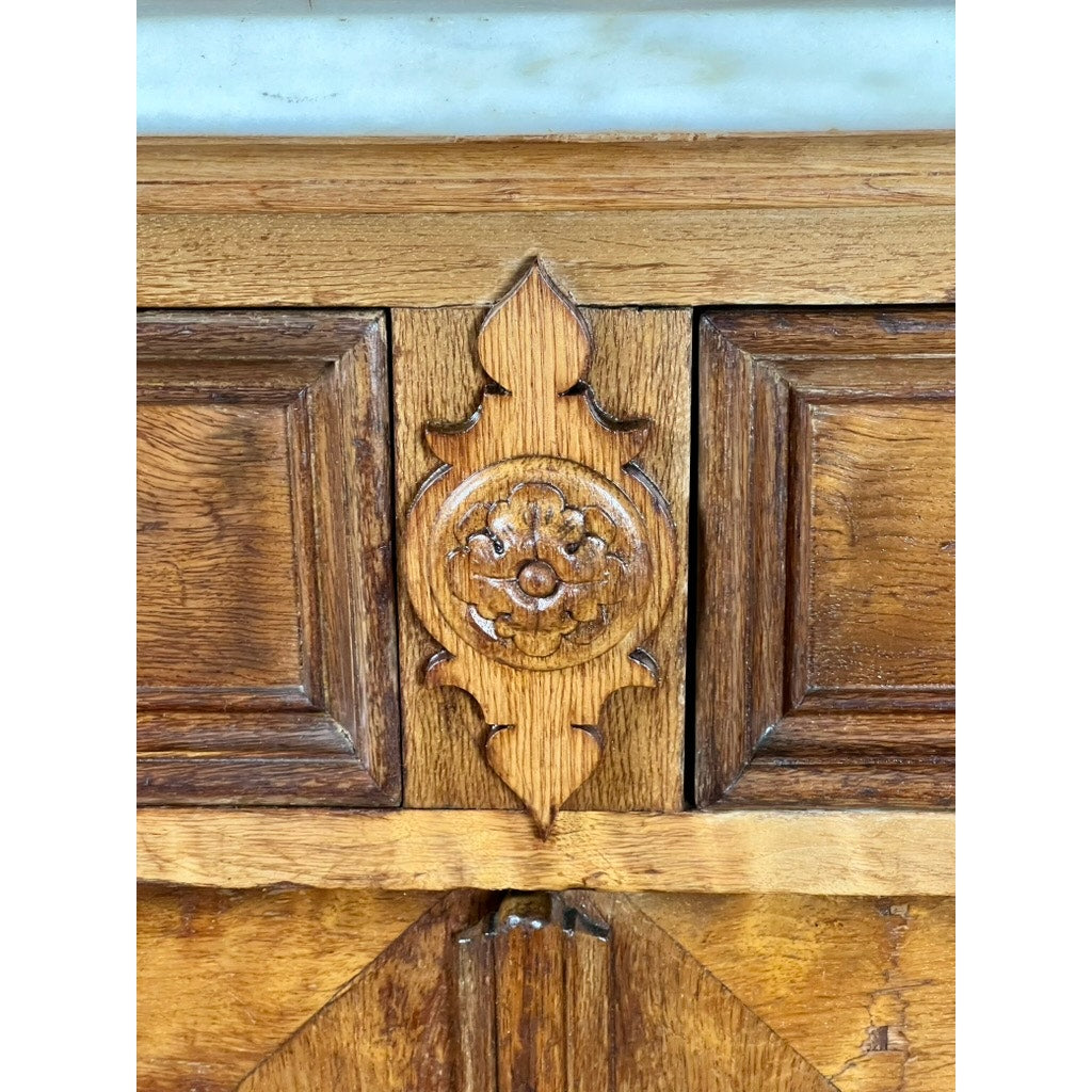 This piece is more than just a functional item of furniture; it is a slice of history, offering both utility and a deep aesthetic appeal. It is ideal for anyone looking to enhance their space with an authentic antique that tells a story, adding character and charm to any room it graces. Whether used in a dining area or as a focal point in an entryway, this buffet remains a testament to the enduring beauty and craftsmanship of French furniture. 83h x 57w x 24d counter height 45
