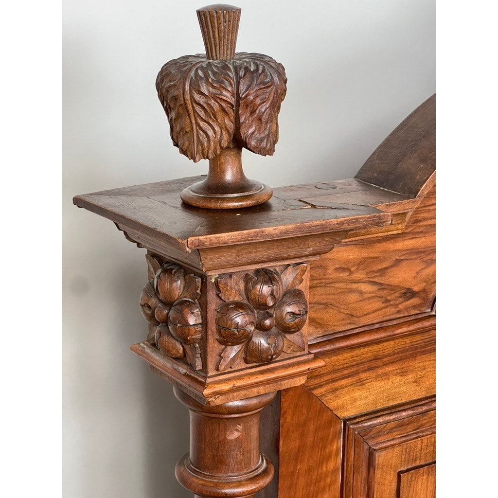 This stunning full-size bed, a relic of the Napoleon III era, exemplifies the luxurious and ornate design principles of 19th-century French craftsmanship. Constructed from rich walnut, the bed’s robust structure features detailed carvings and sculpted elements that celebrate the period’s exquisite attention to decorative arts. The centerpiece, a regal headboard, is crowned with an elaborate floral crest, accentuated by detailed leaf motifs along the sides, highlighting the bed’s stately appearance.