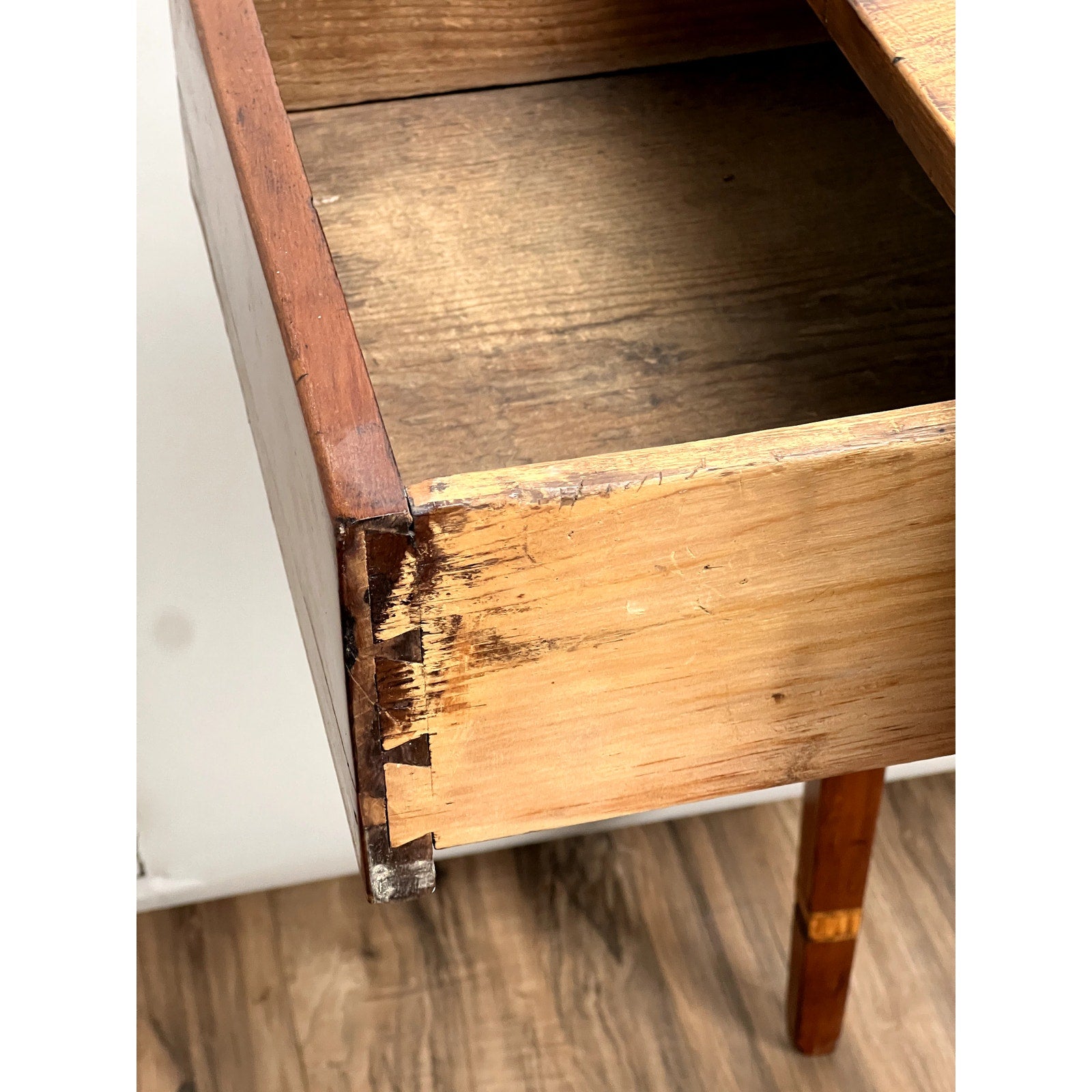 The legs are adorned with a delicate inlaid band near the foot, further adding to the table’s elegance. While the inlay work remains beautiful, there has been some loss to the inlay, as shown in the pictures, which only adds to the table’s charm and authenticity. Despite this, the table remains in excellent condition overall, with minimal signs of age-related wear. The combination of maple, satinwood, and ebony inlays, along with the added drawer, ensures that this drop-leaf table is both a practical and timeless addition to any room. 29h x 36w x 18d closed 35d open