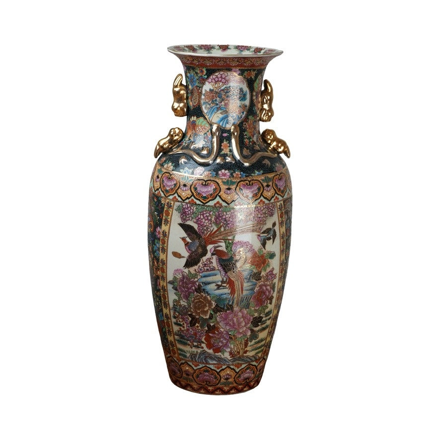 This striking antique Japanese Satsuma-style vase, dating to the early 20th century, showcases the intricate decorative techniques associated with Japan’s celebrated porcelain tradition. Standing an impressive 24 inches tall, the vase is richly painted with vibrant scenes of exotic birds among blossoming peonies, chrysanthemums, and foliage, symbolic of prosperity and longevity. The finely detailed enameling is complemented by gilt accents that highlight the floral borders and figurative elements.