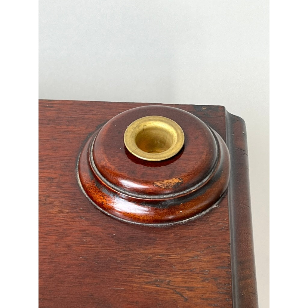 At the top corners of the chest, brass cups inset into turned wood fixtures are likely remnants of what were originally candle holders. This design feature, typical of the Federal period, would have served both a decorative and practical function. It’s possible that these cups were added to the chest as part of a later modification, but given their positioning and form, the most plausible explanation is that they were indeed intended as candle holders, a common feature of furniture from the period.
