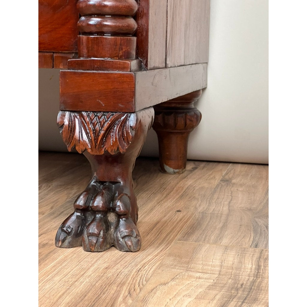 The top of the chest shows some wear and sun damage, as seen in the pictures, but the wood remains quite serviceable. Despite this, the chest retains its original beauty and charm, with the flame mahogany, crystal hardware, and paw feet all contributing to its timeless appeal. This piece continues to be both a functional storage solution and a decorative element, offering a beautiful combination of historical craftsmanship and classic design. 39h x 44w x 22d
