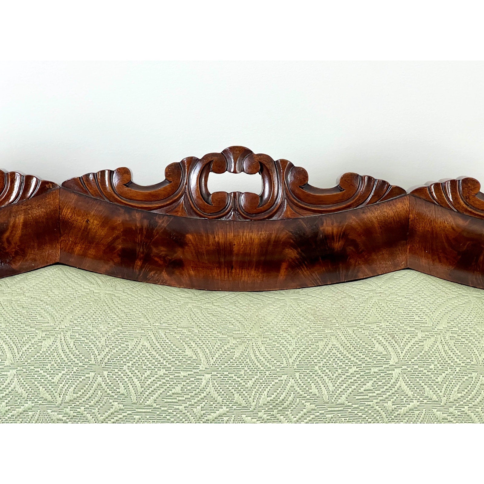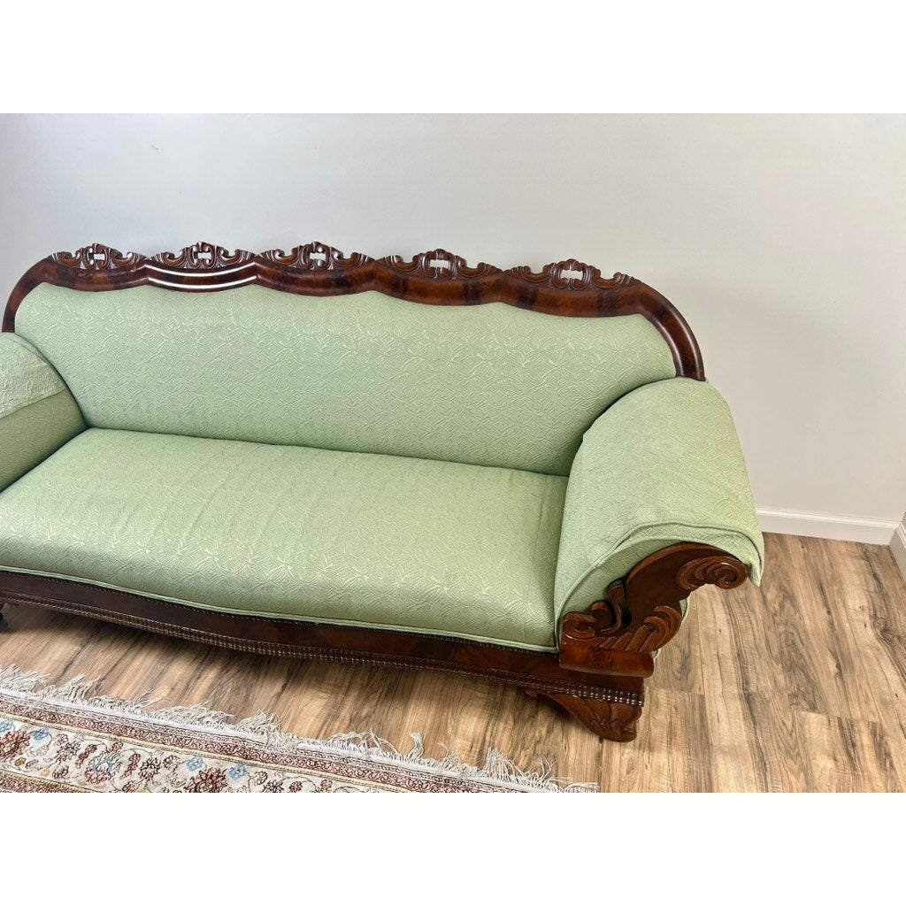 This exquisite sofa is upholstered in a soft, mint-green fabric that accentuates the natural beauty of the mahogany wood. The craftsmanship is highlighted by detailed carvings on the scroll arms and the crest rail, adding an ornate touch to its sophisticated silhouette. Despite its age, the sofa maintains a contemporary feel, blending historical allure with modern-day interiors.