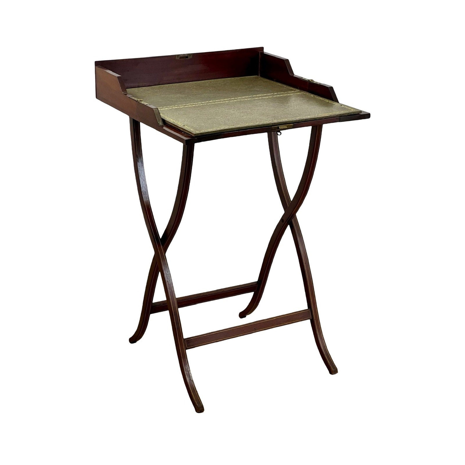 The desk features a foldable structure that supports a green baize-lined writing surface, offering a soft, durable area that adds a luxurious touch while hinting at its extensive use through history. The distinctively curved legs provide a stable base, tucking away neatly for transportation or storage, embodying the essence of campaign furniture designed for the rigors of travel.