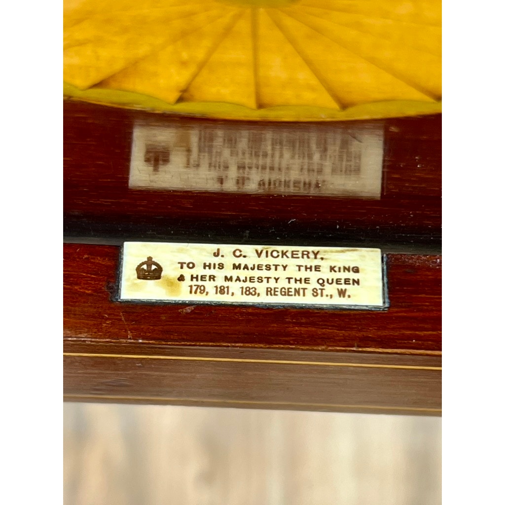 This exquisite antique folding campaign desk is a testament to the fine craftsmanship of J.C. Vickery, who was renowned for supplying goods to the highest echelons of society, as proudly stated on the plaque “J.C. Vickery To His Majesty the King & Her Majesty the Queen”. Crafted from rich mahogany, this desk exemplifies the functional elegance required by traveling aristocracy of the early 20th century. The smooth finish and compact design showcase the practicality needed for mobility, without sacrificing the aesthetic appeal.