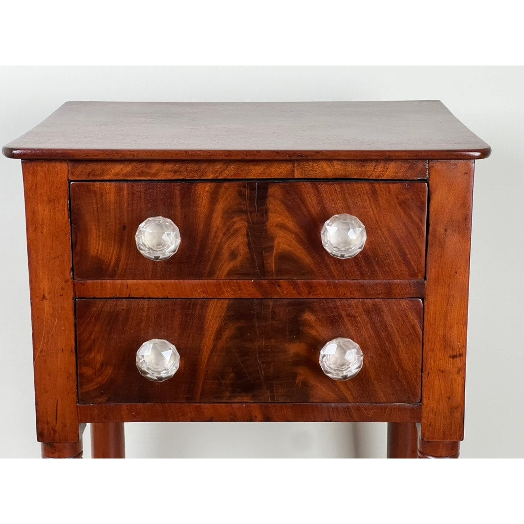 This charming two-drawer stand, dating to circa 1820, exemplifies the elegance of Federal Period design, specifically from the Sheraton style. Crafted from rich mahogany, the piece showcases the warmth and depth of the wood’s natural grain. The stand features two drawers adorned with classic, faceted glass pulls, offering a touch of refinement. These hardware details perfectly complement the gently fluted, turned legs, which add an air of lightness to the solid form.