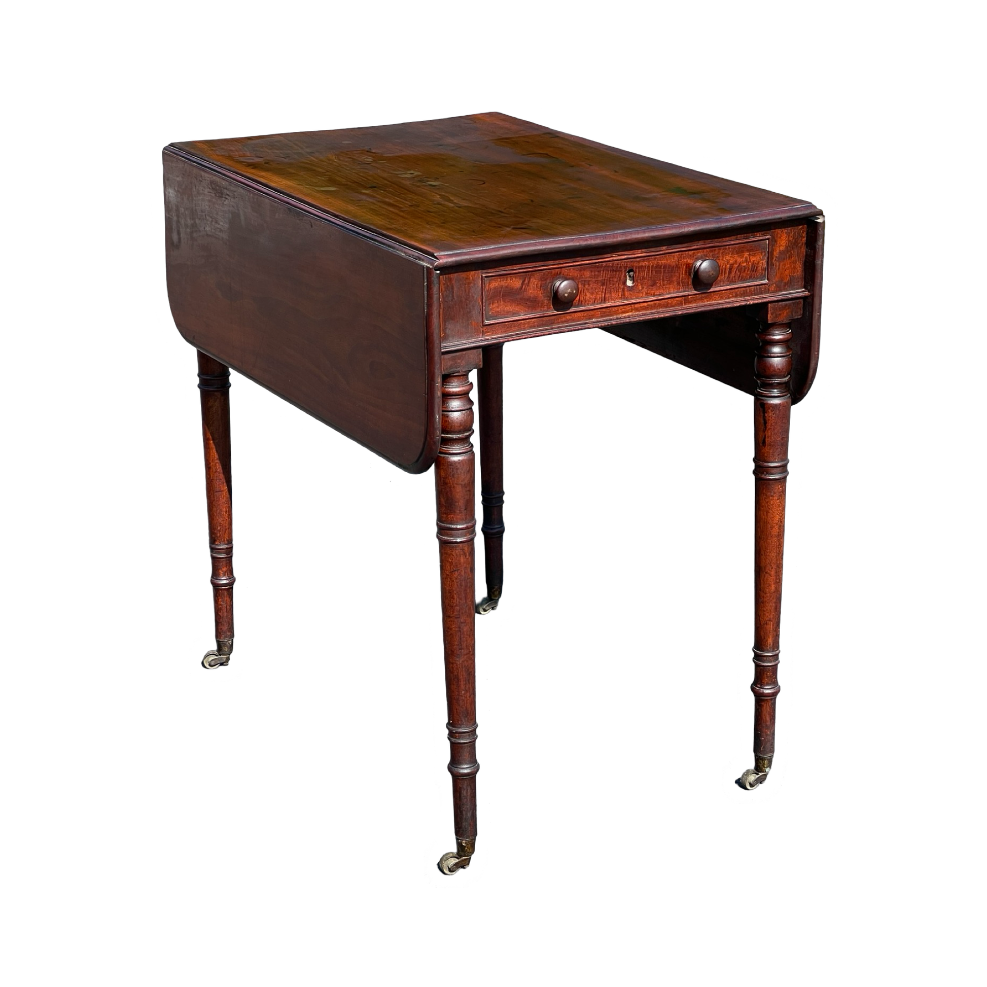 Ideal for lovers of historical furniture, this Sheraton drop leaf table not only serves as a functional asset but also as a piece of art that reflects the rich history and sophistication of George III furniture. Its presence in a modern home offers a touch of antique grace, perfect for both everyday use and special occasions, embodying the craftsmanship and style of a bygone era. 29h x 20w x 30d closed 38w open