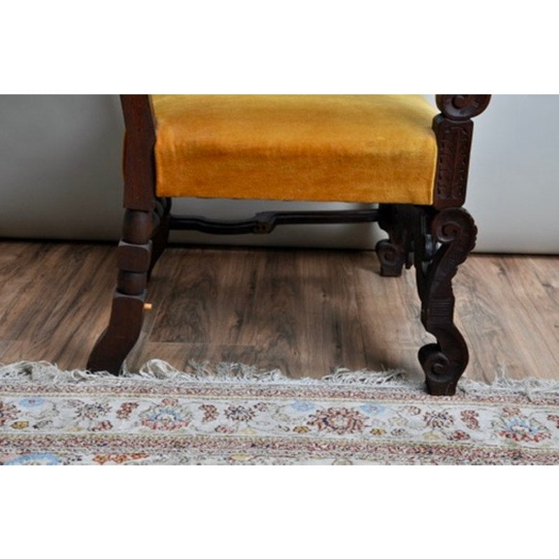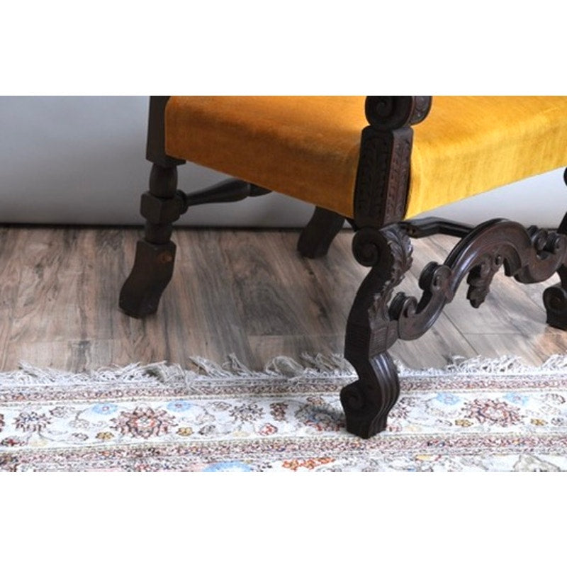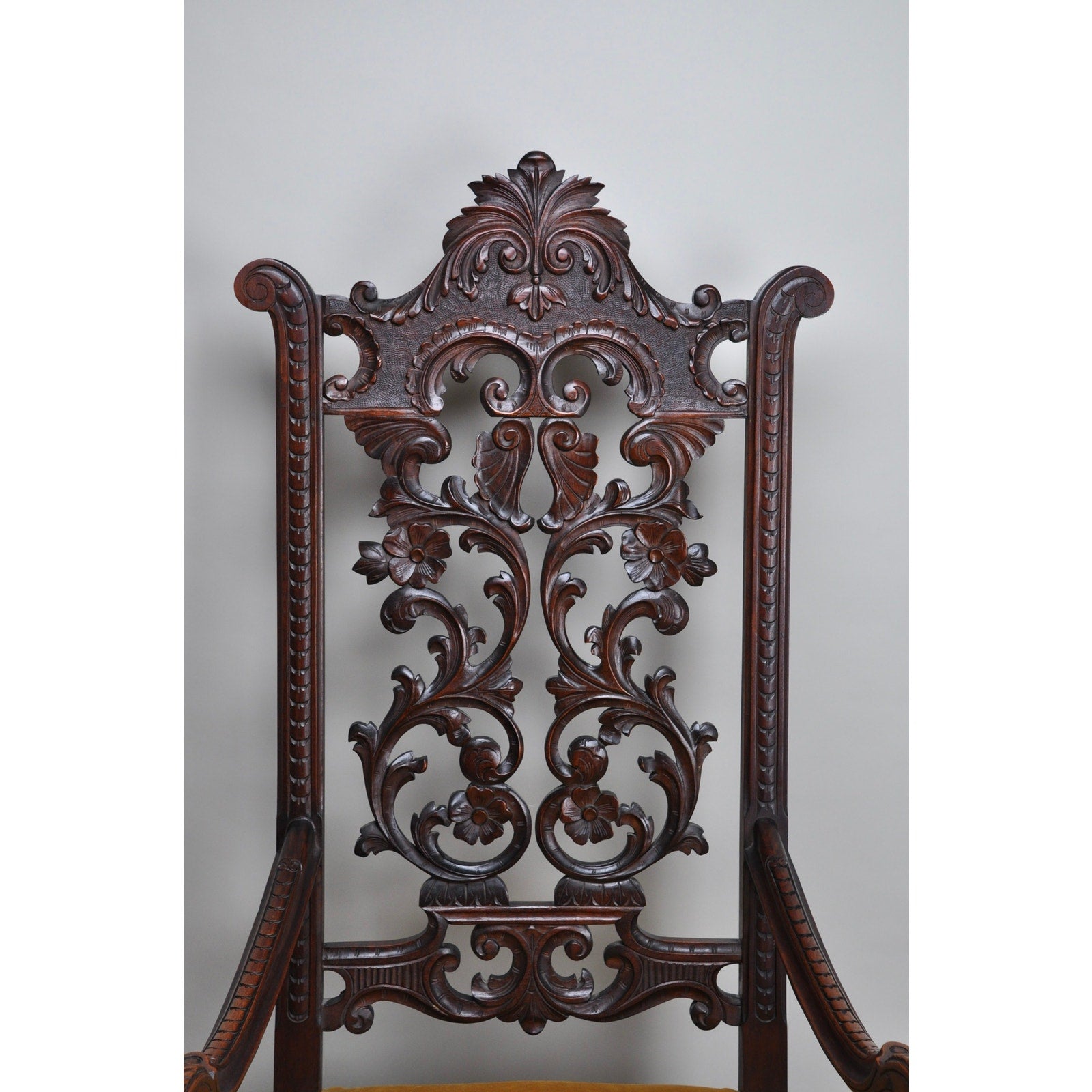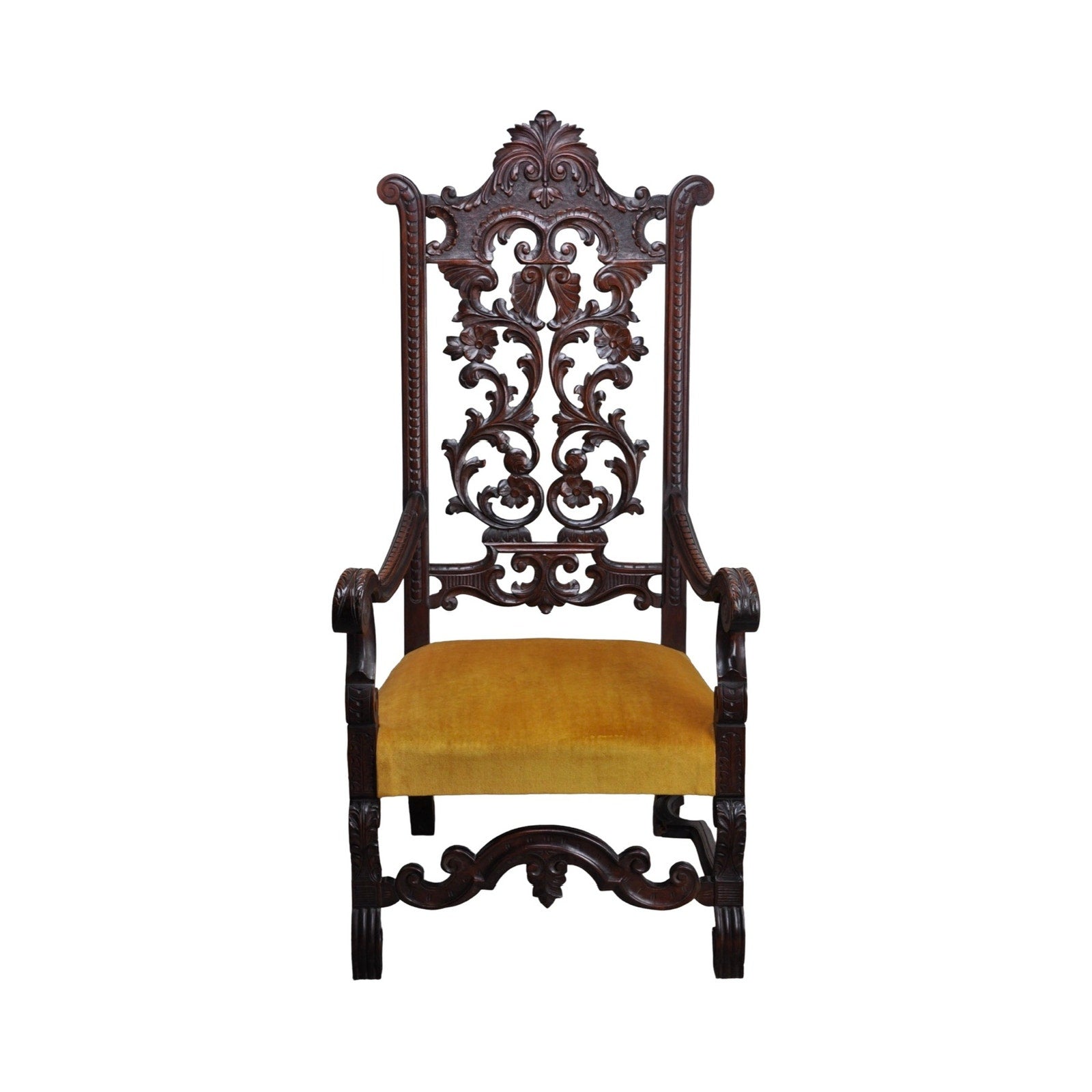 Upholstered in sumptuous golden velvet, the seat provides a luxurious contrast to the rich, dark wood, offering comfort that invites one to sit and enjoy its grandeur. This upholstery complements the chair’s sophisticated aesthetic, enhancing its overall appeal and providing a plush seating experience.