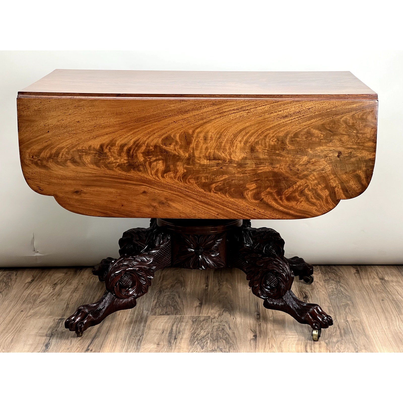 The drop leaf design allows for flexibility, easily expanding or contracting the table to fit various spaces. When the leaves are folded down, the gracefully curved edges enhance its elegant silhouette. The intricately carved pedestal base features floral motifs and sculpted paw feet, adding both stability and visual interest. The small brass casters make it easy to move the table, a practical feature that also complements its decorative appeal.