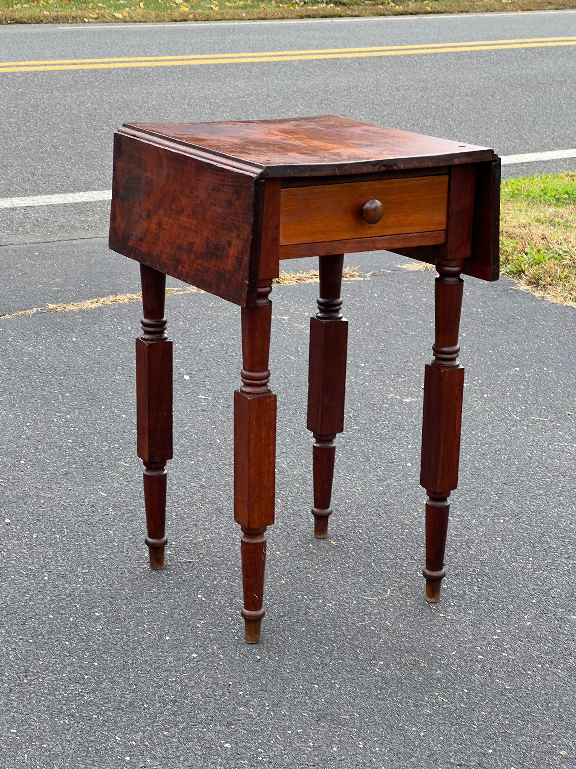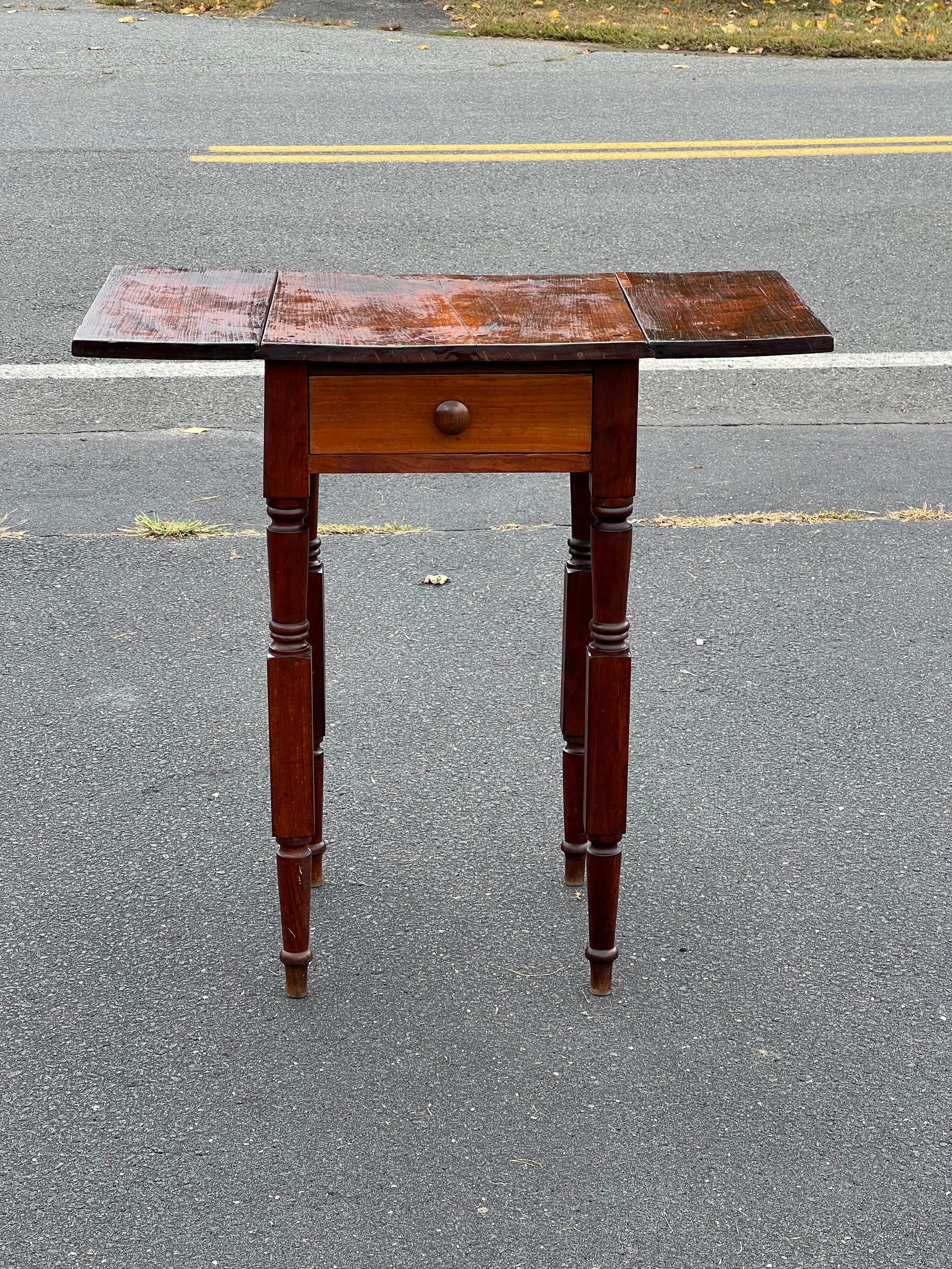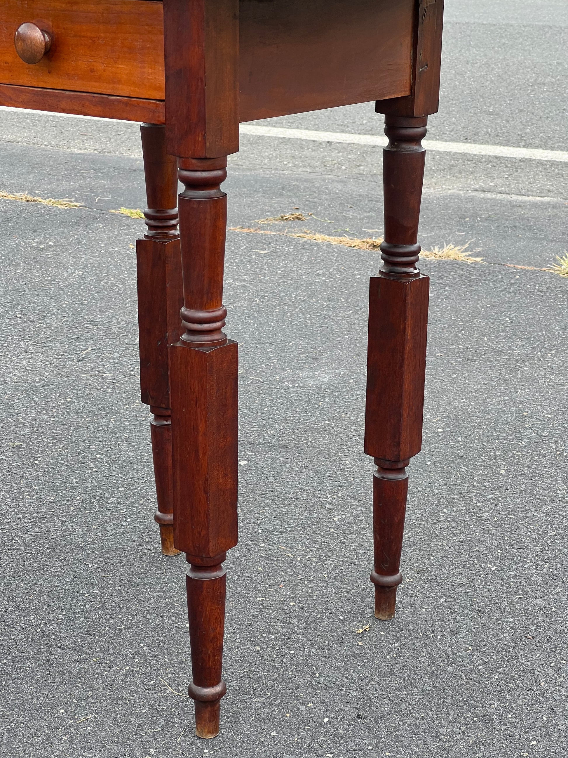 Antique New York Sheraton One Drawer Stand c. 1800 having the iconic square legs flanked by turnings that defines this regional style representing the extreme wealth in New York society at the time. This work table features small drop leafs at either side that made the table more useful for sewing or needle work. 29h x 17w x 18d closed