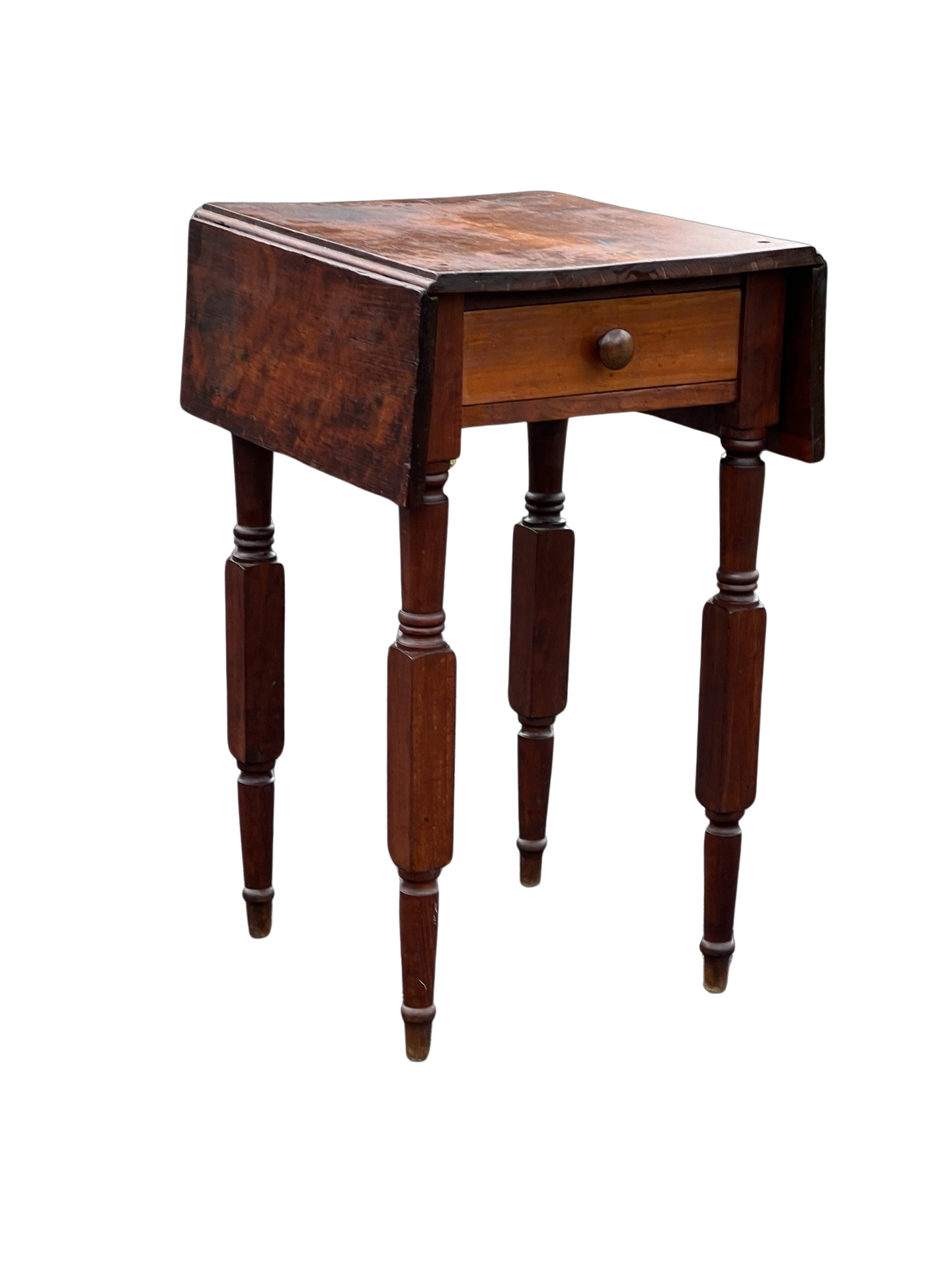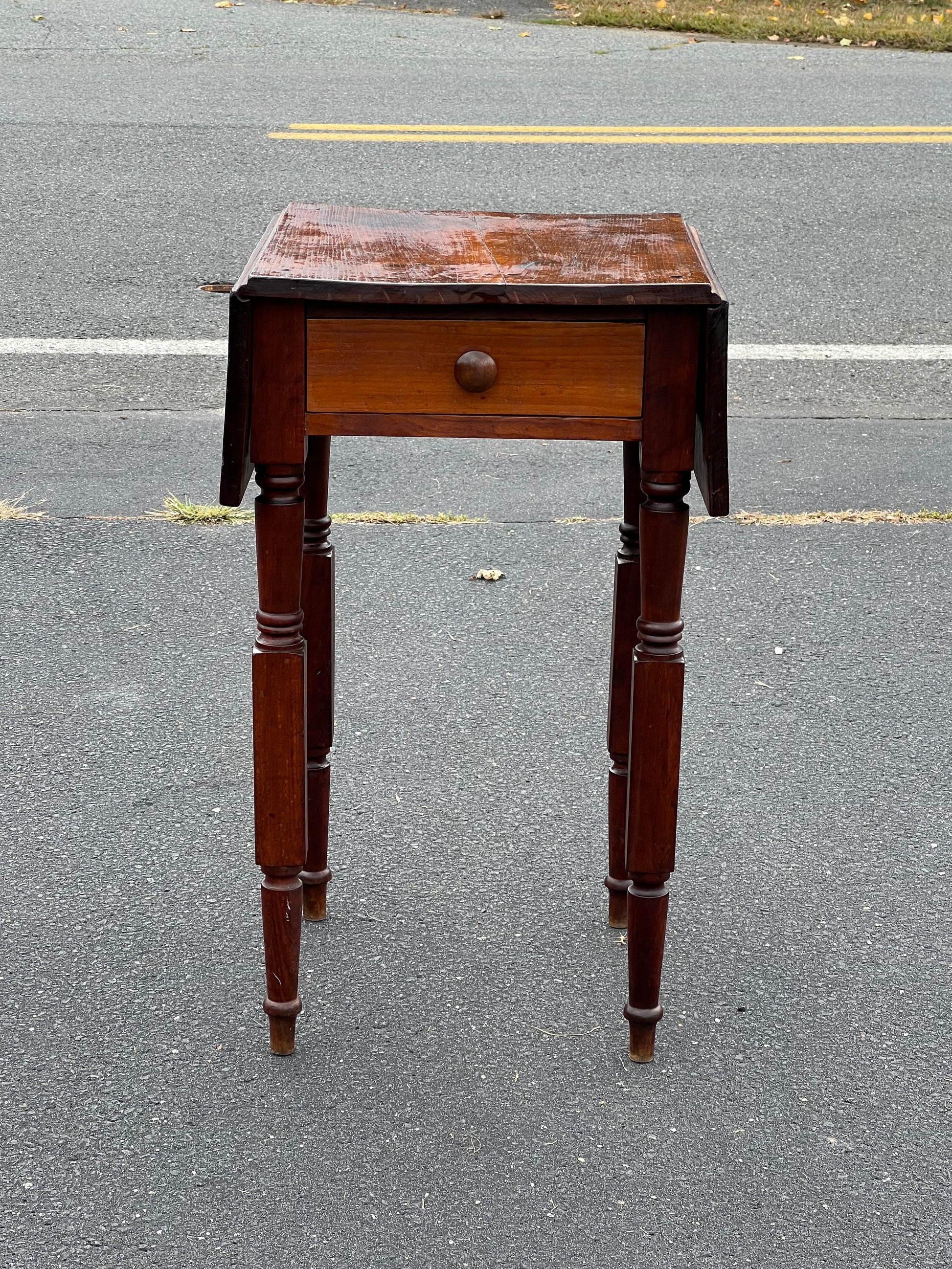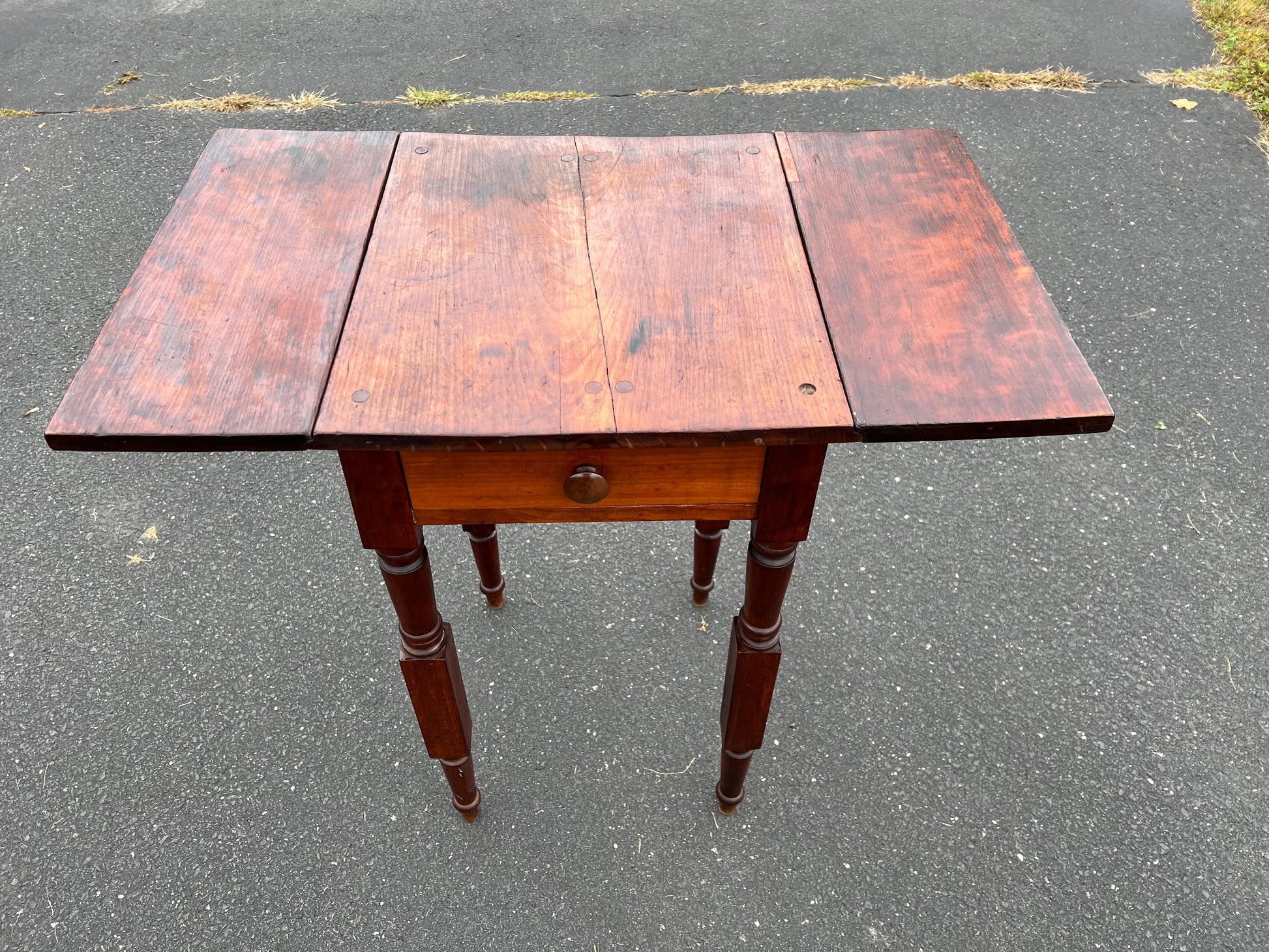 Antique New York Sheraton One Drawer Stand c. 1800 having the iconic square legs flanked by turnings that defines this regional style representing the extreme wealth in New York society at the time. This work table features small drop leafs at either side that made the table more useful for sewing or needle work. 29h x 17w x 18d closed