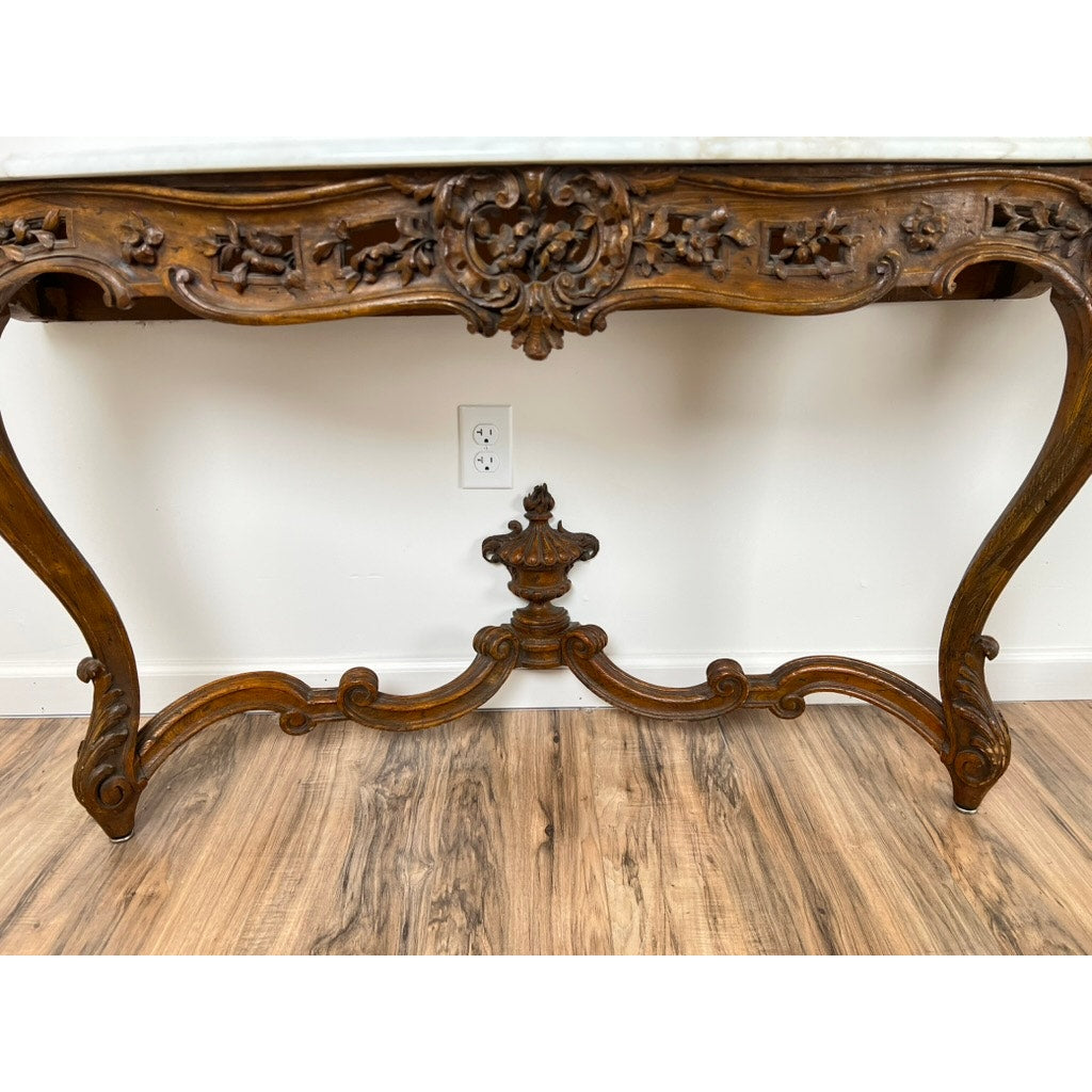 These stunning Antique Louis XV Rococo Portor de Pyrénées Console Tables date back to the late 18th century and are crafted from finely detailed carved wood with a rich patina. The tables are topped with exquisite marble, which complements the ornate woodwork featuring floral motifs and scrolled accents typical of the Rococo period. Their elegant, curvaceous legs and delicate carvings give them an air of sophistication that would have been highly coveted during their time.