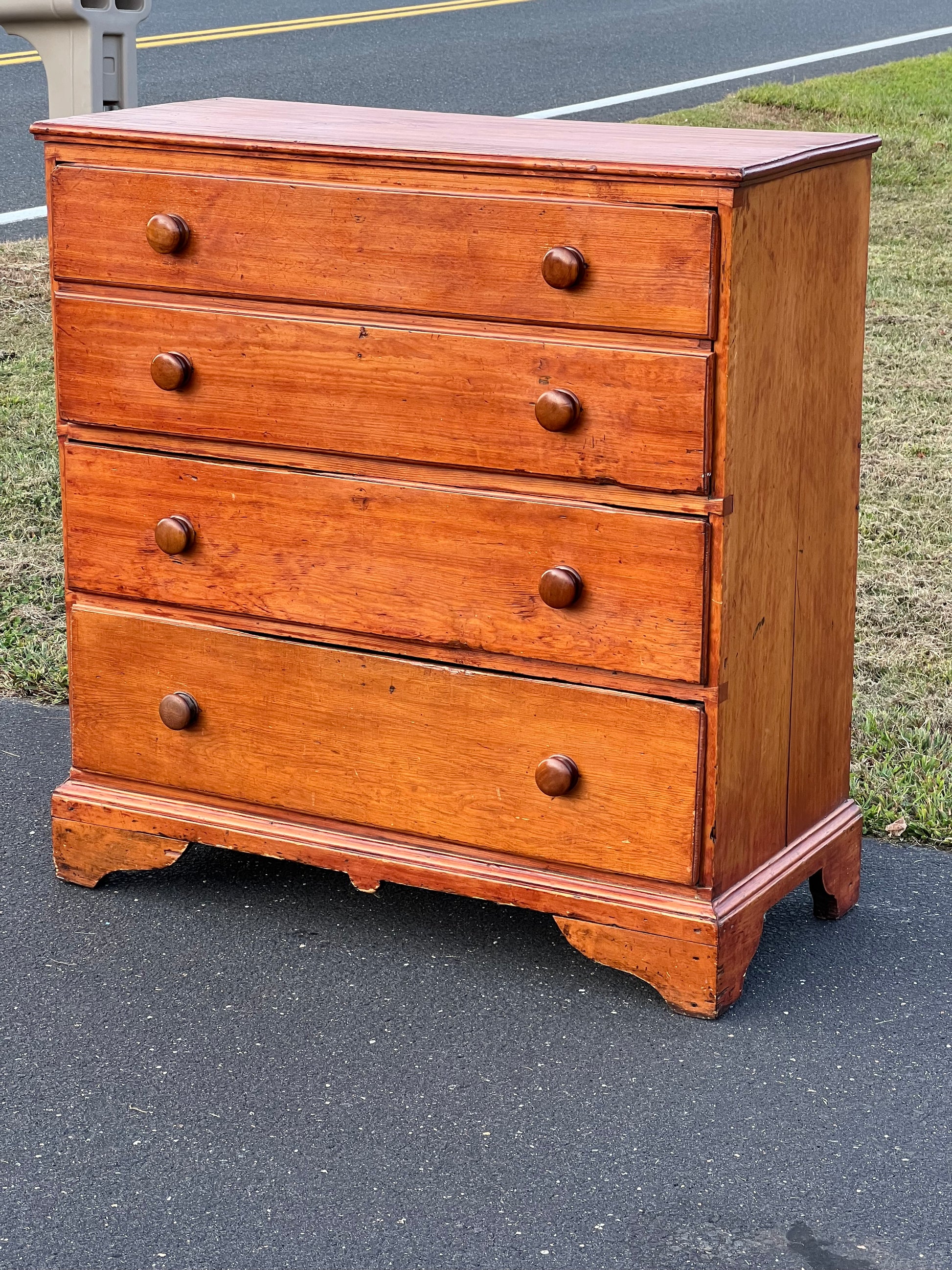 Beneath the double top drawer, the chest holds three additional drawers, each fitted with round wooden pulls. These pulls contrast appealingly with the rich pine, adding a touch of simplicity and rustic charm. The bracket base below these drawers provides sturdy support, its design contributing a subtle architectural flair that is characteristic of the Chippendale style, known for its balanced proportions and timeless allure.