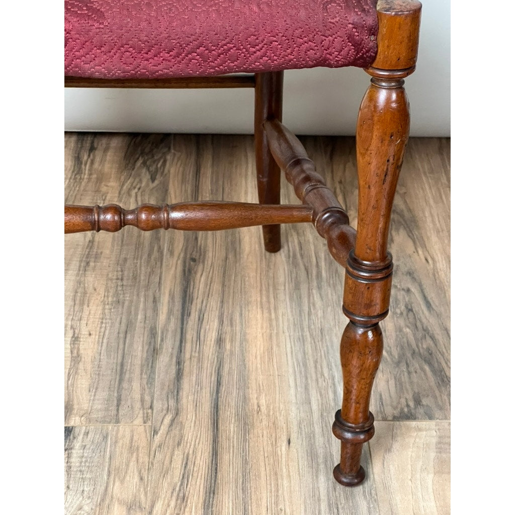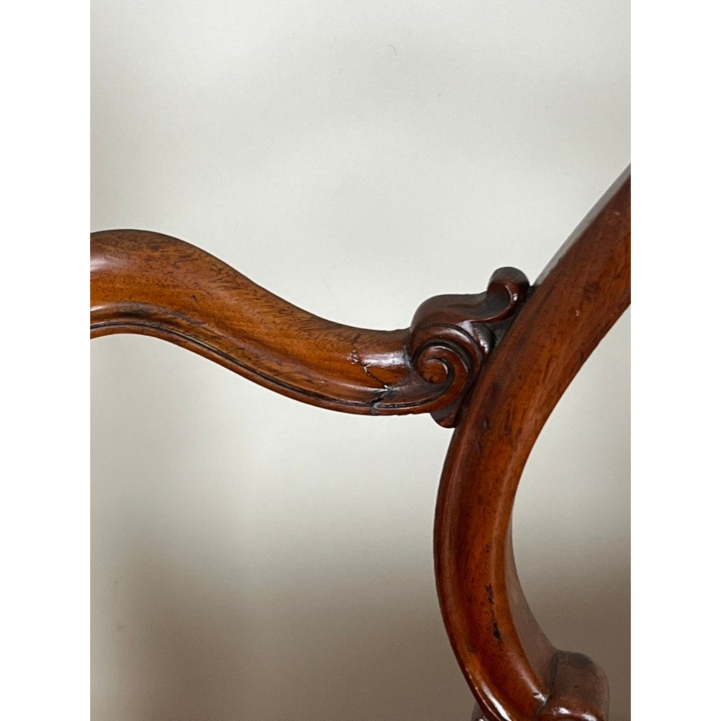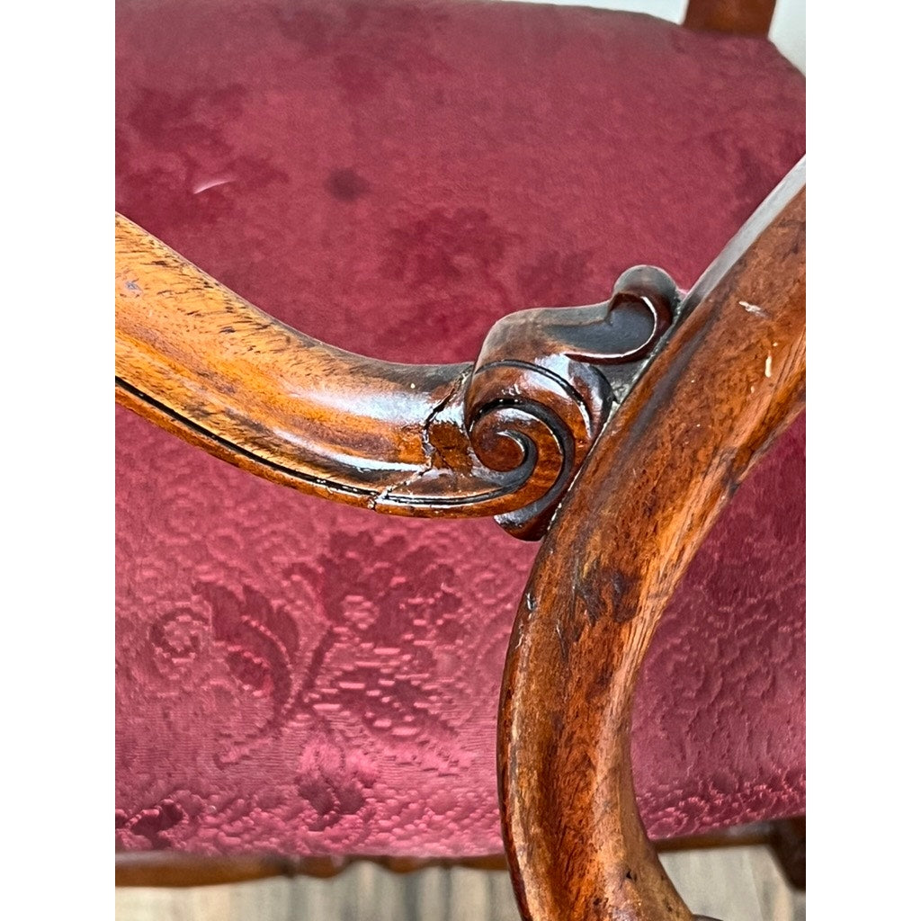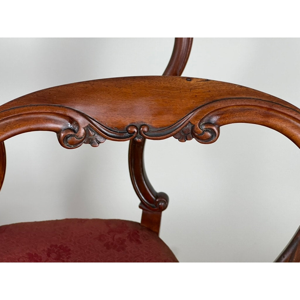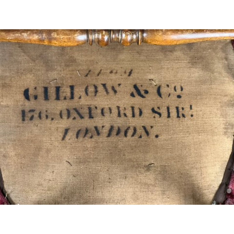 This set of four English William IV walnut chairs by the esteemed maker Gillow & Co. London, c. 1835, showcases exceptional craftsmanship from one of London’s most respected cabinet makers. The chairs feature elegantly carved backrests with intricate floral detailing, highlighted by a gently curving top rail and flanked by turned spindles. The solid walnut frames have been beautifully crafted with delicate proportions and a warm, rich finish. The seats are upholstered in a deep burgundy fabric, which complements the warm tones of the wood and remains quite serviceable, though fresh upholstery would enhance their overall comfort.
