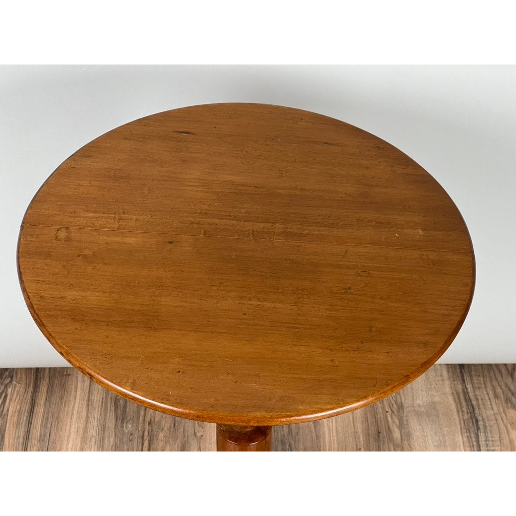 The stand features a gracefully turned, fluted central column, supported by a tripod base with scrolled feet. It remains in nice antique condition, with minimal wear consistent with its age, allowing its natural beauty to shine through. The slender yet sturdy legs and elegant form make it ideal for use as a side table or a decorative accent piece, while its light size and simple yet stylish design allow it to fit seamlessly into a variety of interior settings. This candle stand is a timeless addition, complementing both period and contemporary decor, adding an element of understated sophistication to any space. 25h x 17w x 17d