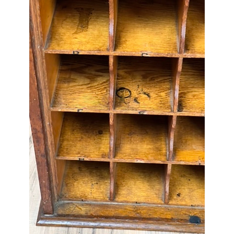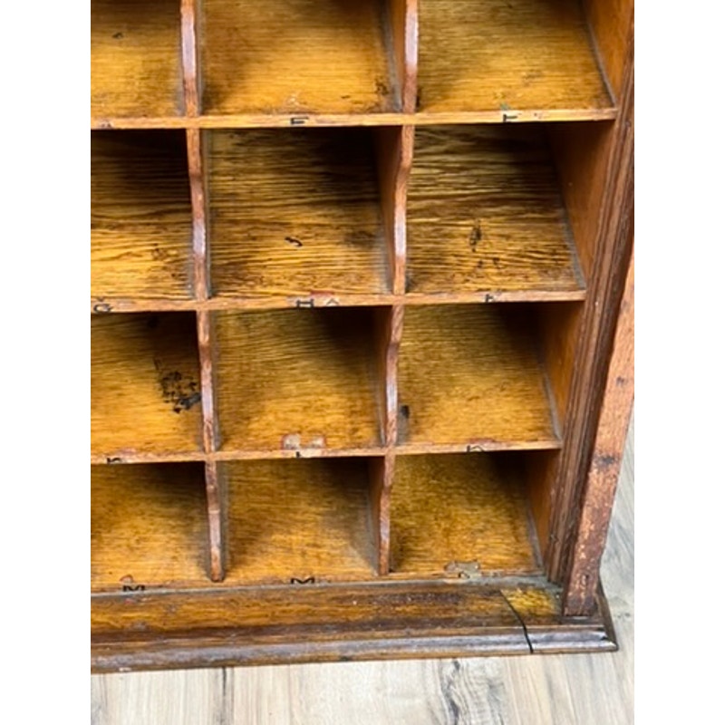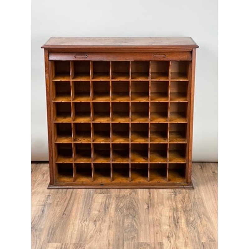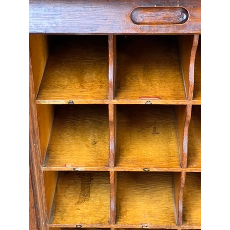 The tiger oak finish has aged beautifully, revealing the rich, warm tones and striking patterns of the wood. The cabinet’s top portion, with its soft curves and smooth lines, contrasts with the vertical structure of the pigeon holes beneath, creating a harmonious balance. The pull-out drawer above the pigeon holes is the perfect spot for storing more personal or private items, while the open compartments below invite endless possibilities for organization and display.