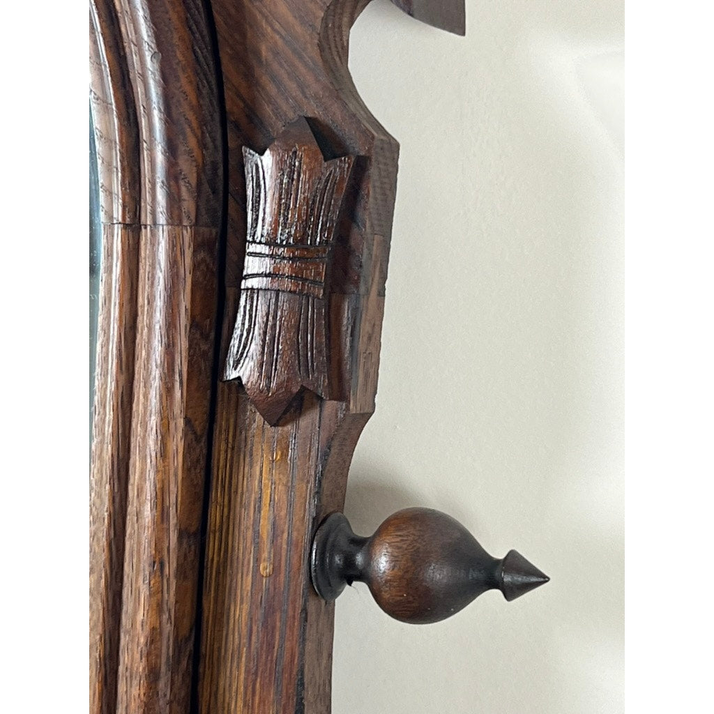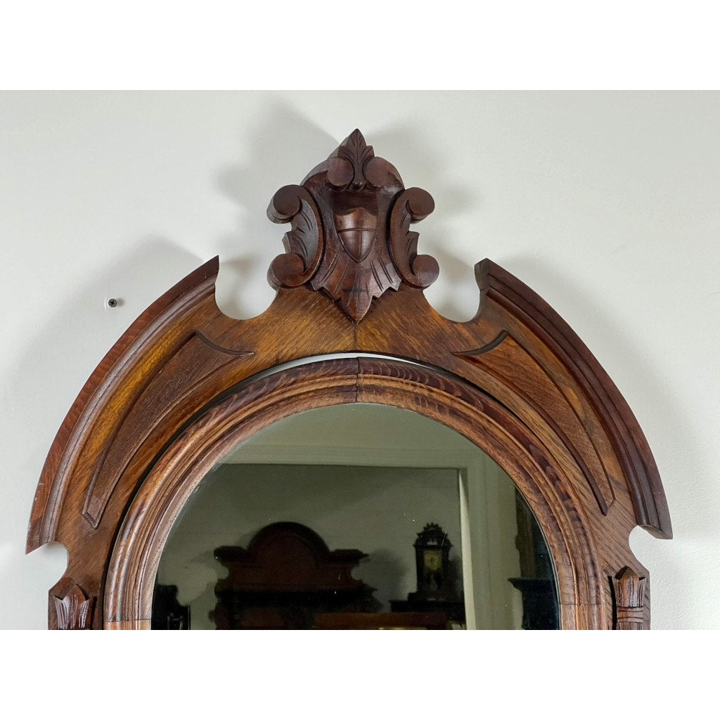 The dresser features four spacious drawers, each adorned with ornately carved pulls that reflect the intricate style of the Victorian period. These functional elements blend utility with aesthetics, offering ample storage space while enhancing the overall elegance of the dresser. One of the pulls has a minor piece missing, a testament to the dresser’s venerable age and historical journey, yet this does not impede the drawer’s functionality.