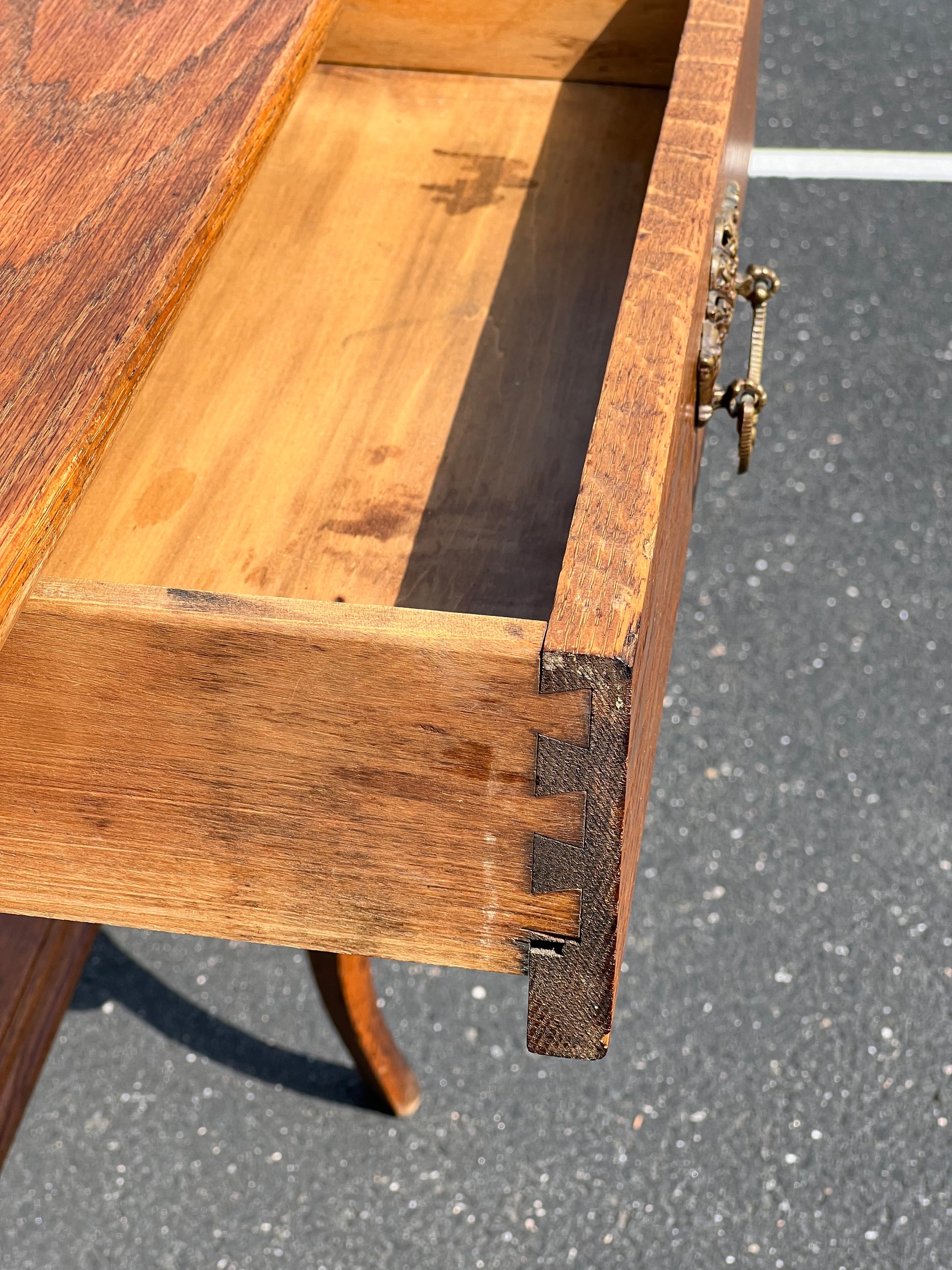 This antique Victorian oak side table is a charming piece of furniture that blends functionality with aesthetic appeal. It features a straightforward, robust design with a single drawer, adorned with an ornate metal pull that adds a touch of elegance. The table stands on gracefully curved legs, which provide stability and a classic silhouette.