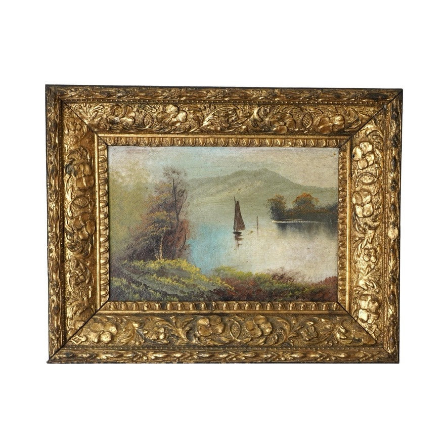 Antique Victorian Oil on Board Painting of Lake Scene with a Sailboat Unsigned c. Late 19th Century