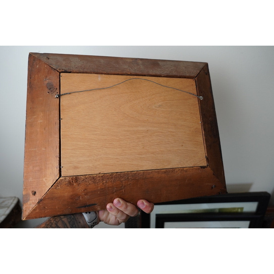 The painting is housed in a richly carved giltwood frame with floral and foliate motifs, enhancing its stately presence. Though unsigned, the work reflects the romantic landscape tradition beloved during the Victorian period. Condition notes: there is some surface wear and age-related toning to the painting, as well as wear to the gilt frame consistent with age and use. A beautiful piece of 19th-century decorative art, ideal for adding period charm to a wall or collection. 14h x 18w x 3d