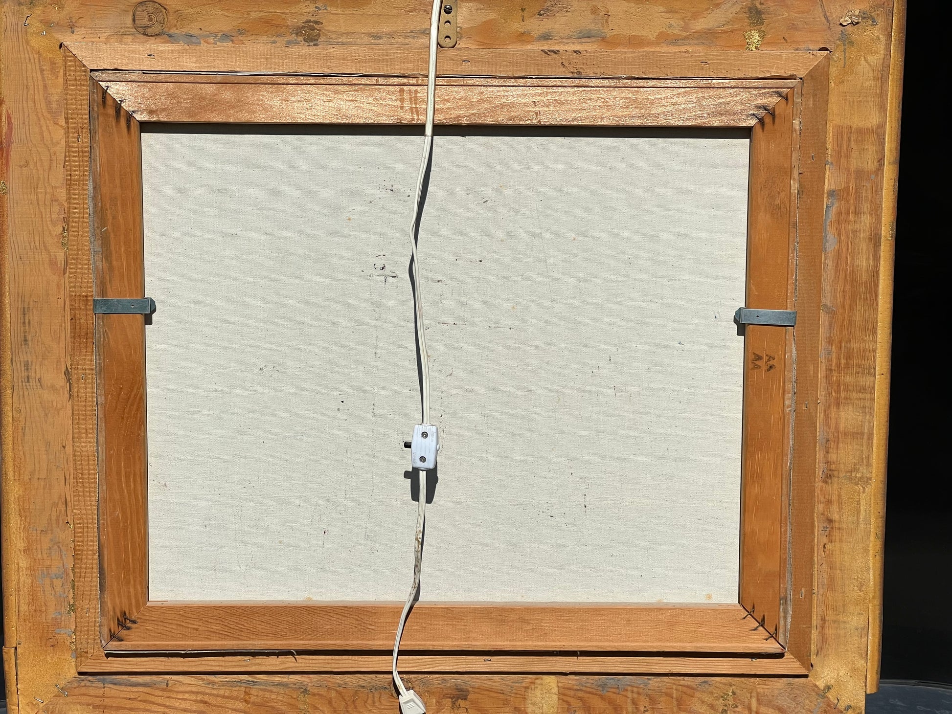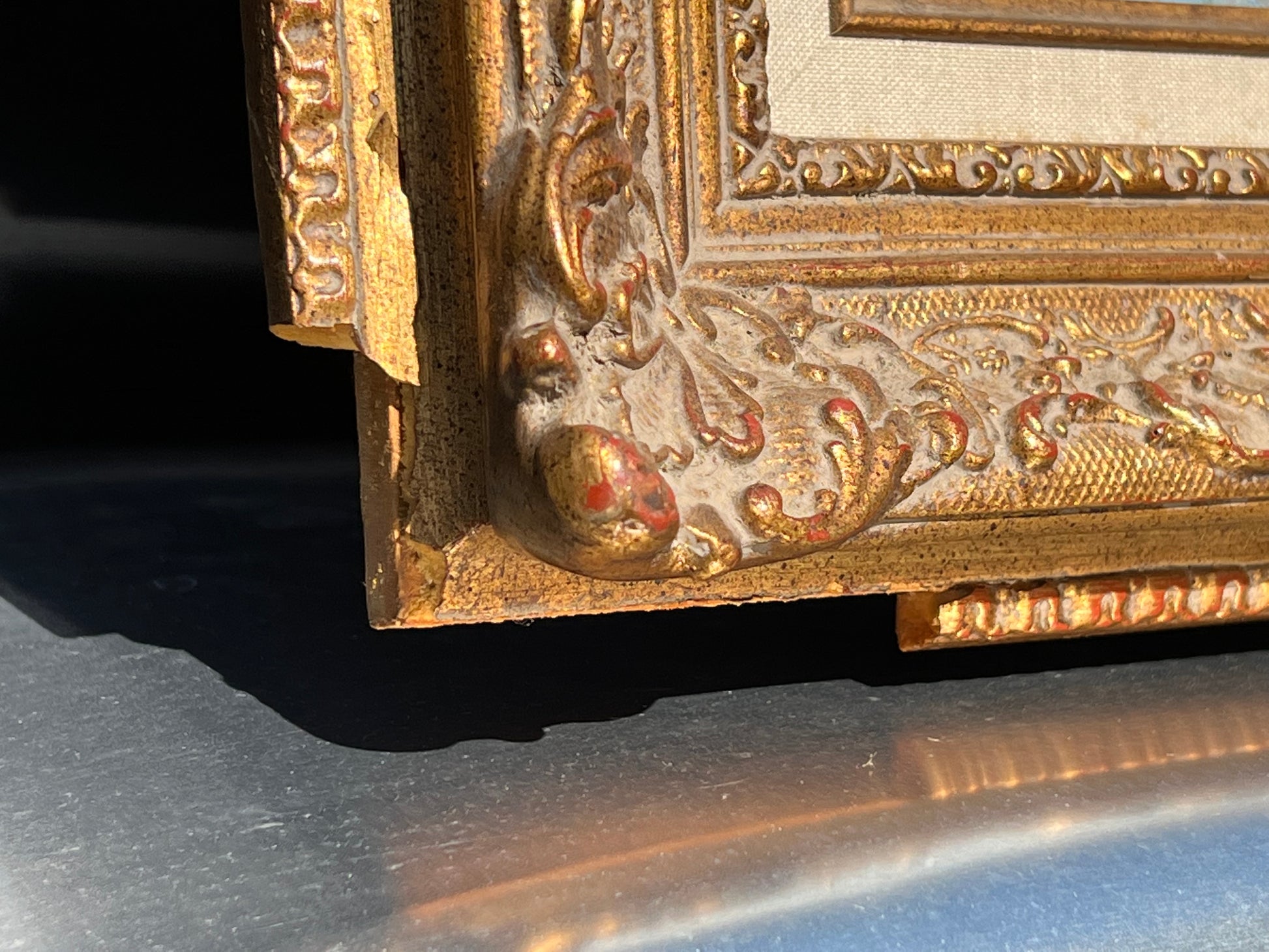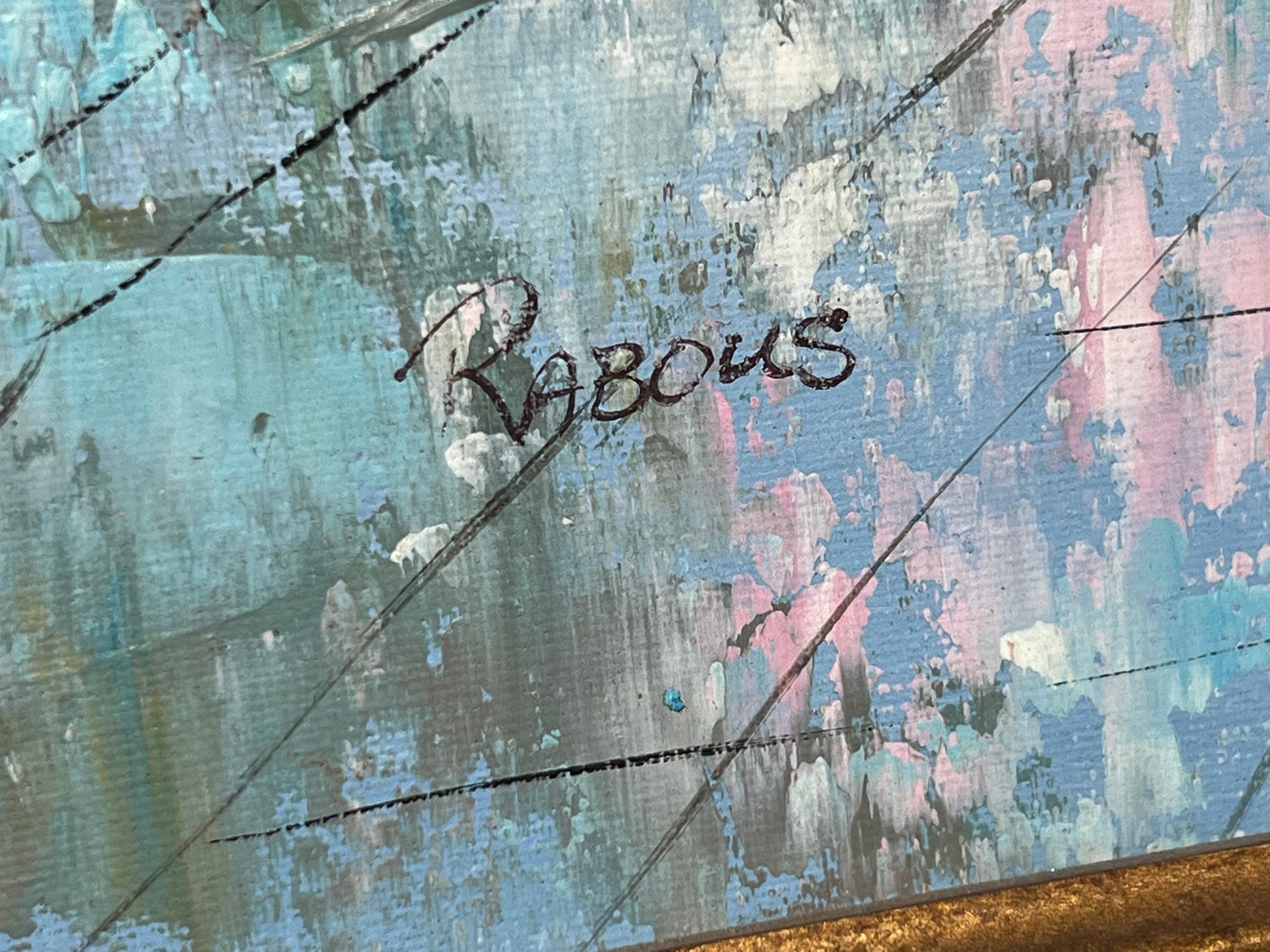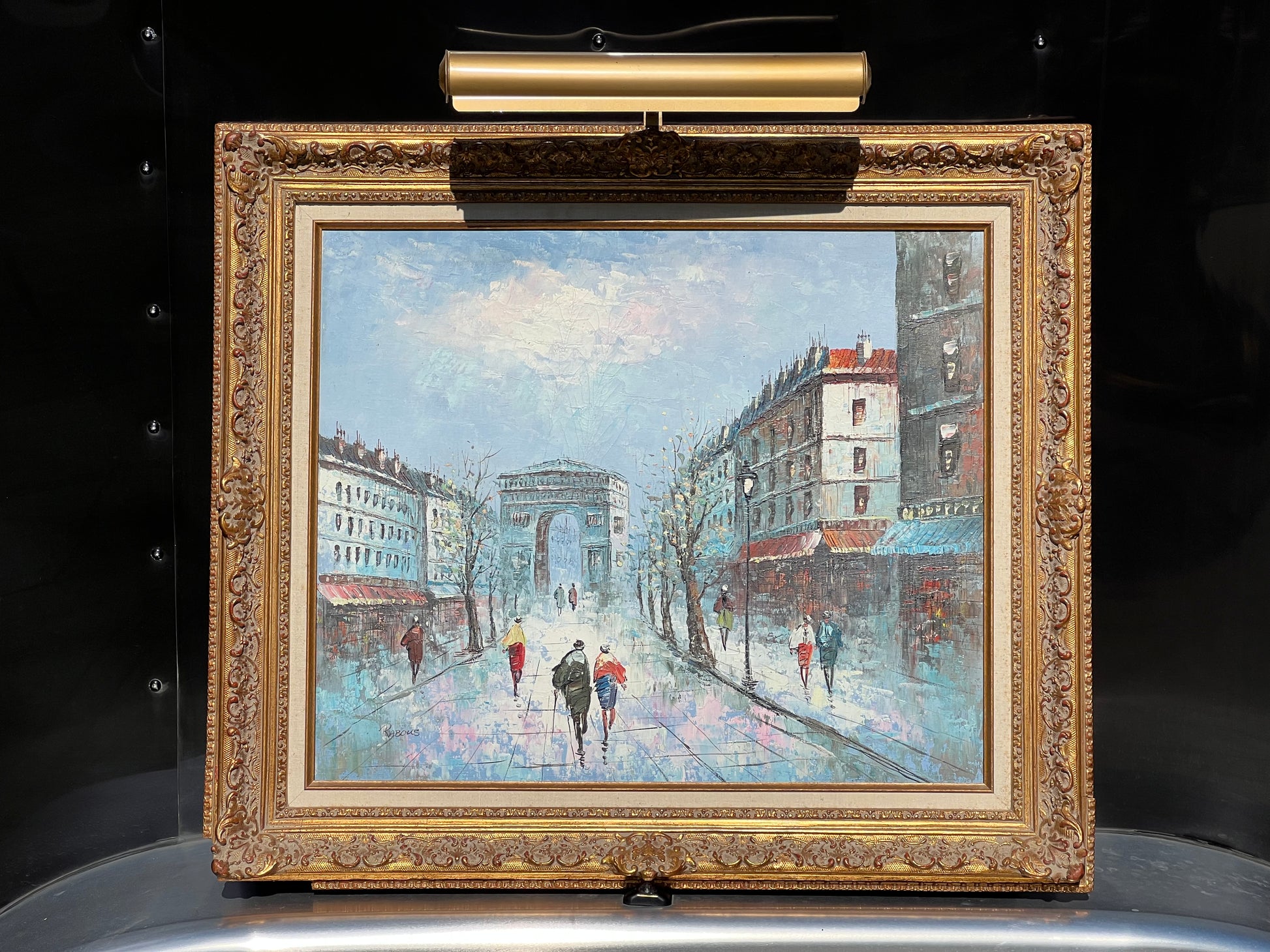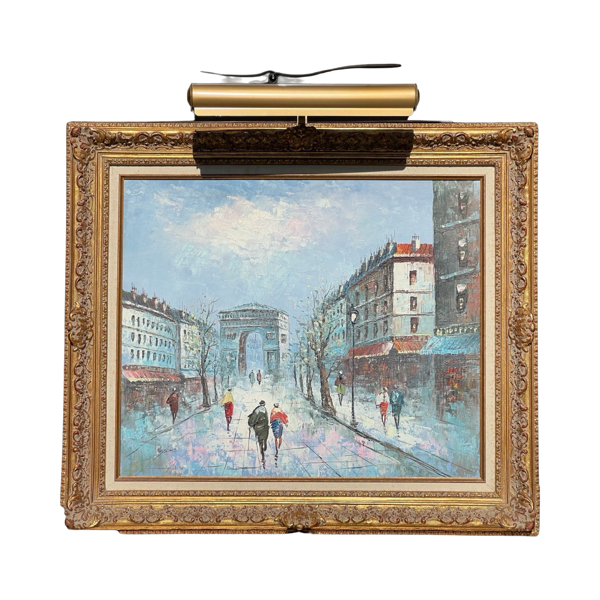 L’Arc de Triomphe Impressionist Paris Street Scene Oil on Canvas by Listed Artist Xavier Rabous. Presented in gilded frame with gallery light. The frame has minor damage lower left (pictured) Dimensions with frame 27h x 31w