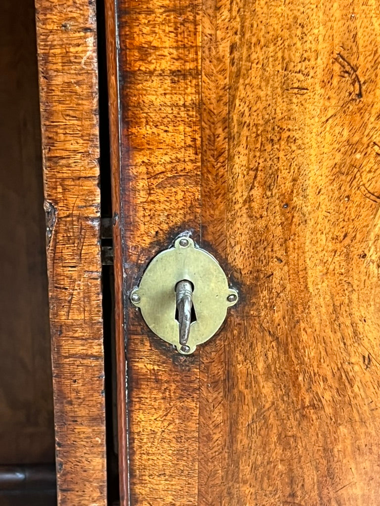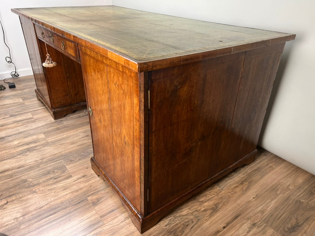 The design of the desk reflects the sophistication and strength typical of the George II period, with sturdy proportions and clean lines. The cabinet doors open to reveal additional storage, and the central drawer provides easy access for everyday use. The splayed feet provide a subtle lift, enhancing the desk’s elegant presence despite its size. The desk’s classic proportions make it a perfect choice for a study or office, providing not only ample storage but also a visually striking piece that can complement a variety of interiors.