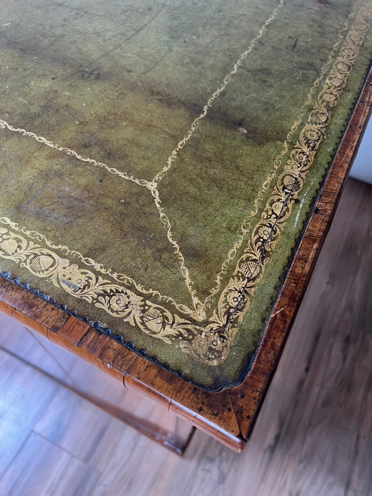 There are some veneer repairs and minor loss, typical of a piece of this age, which add to its character and history. Additionally, this particular desk is unfinished on the back, meaning it would need to be placed against a wall for optimal display. These minor imperfections and the unfinished back aside, the desk remains a stunning example of Georgian craftsmanship, offering both functionality and historical charm. 31h x 73w x 36d knee height 25