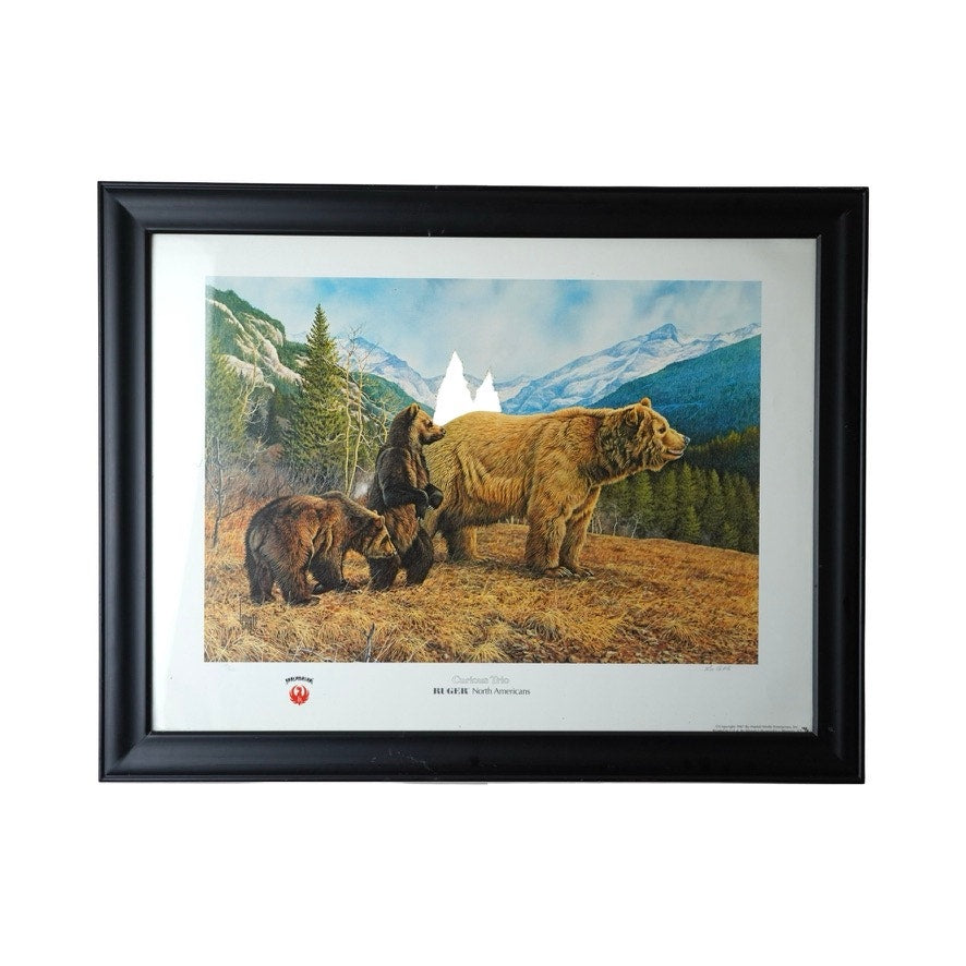 This limited edition wildlife print, Curious Trio by Frank Cable, depicts a mother bear with two playful cubs exploring the forest edge against a dramatic mountain backdrop. Commissioned by Ruger North American, the piece showcases Cable’s signature attention to detail and lifelike naturalism, making it a standout example of late 20th-century American wildlife art.