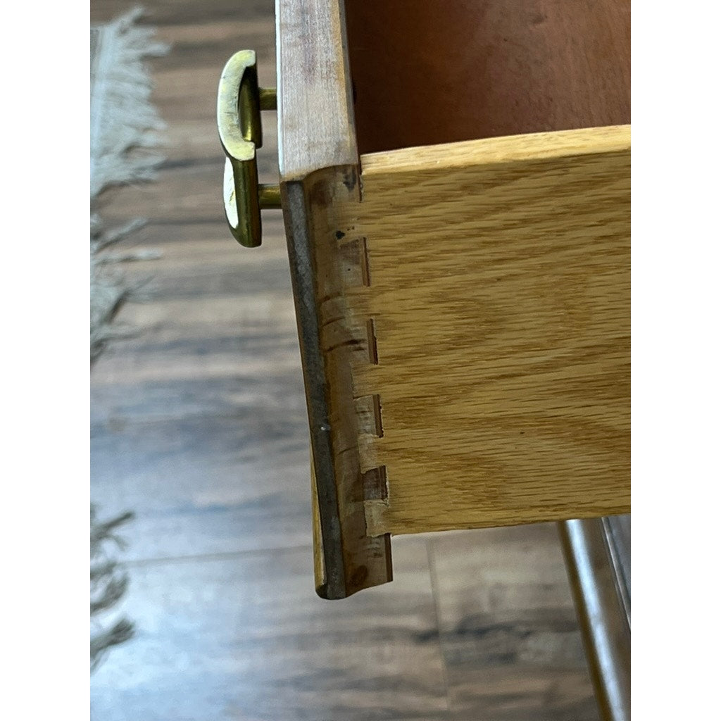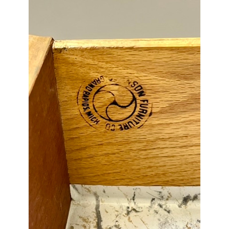 Step back into the mid-20th century with this splendid Johnson Paul Frankl dresser, a hallmark of mid-century modern design. Its straight, clean lines and minimalistic appeal are complemented by the warm, natural finish of the wood, bringing both style and practicality to any contemporary space. The dresser features eight smoothly operating drawers, each outfitted with brass pulls, providing ample storage for a variety of personal items.