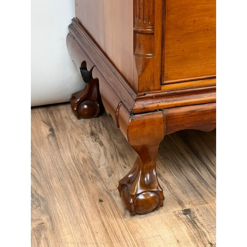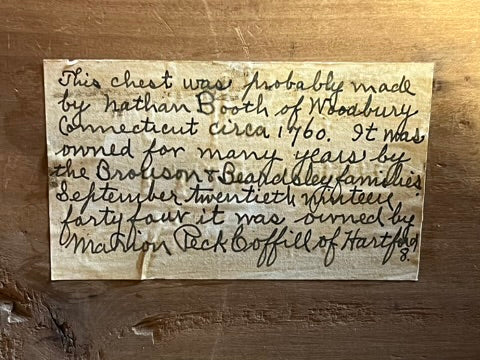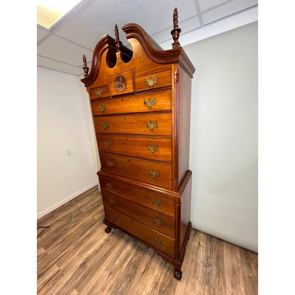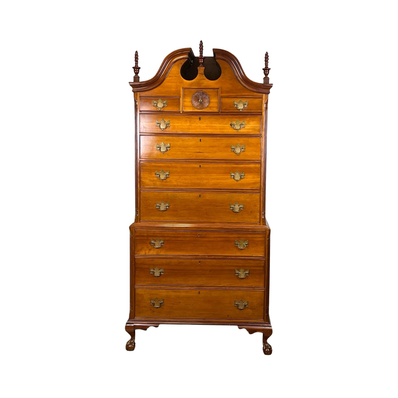 The upper section features a beautifully shaped bonnet top with turned finials, a hallmark of the high style found in 18th-century American furniture. Below the bonnet top, the chest displays a highly functional arrangement of multiple drawers, offering ample storage space while maintaining a refined and balanced appearance. The cabriole legs with carved claw and ball feet add an extra layer of detail and elegance, highlighting the fine craftsmanship that Nathan Booth was known for.