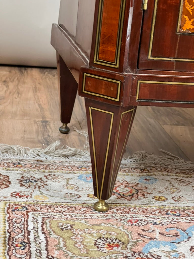 This Secrétaire à Abattant, crafted in the French Louis XVI style in the late 19th century, remains a striking example of neoclassical elegance and masterful craftsmanship. The rich mahogany veneers, with their beautiful, flowing grain, are complemented by intricate inlays of floral patterns in contrasting woods, which enhance the refined aesthetic of the piece. The drop-front desk opens to reveal a practical writing surface and organized compartments, making it both functional and a stunning focal point in any space.